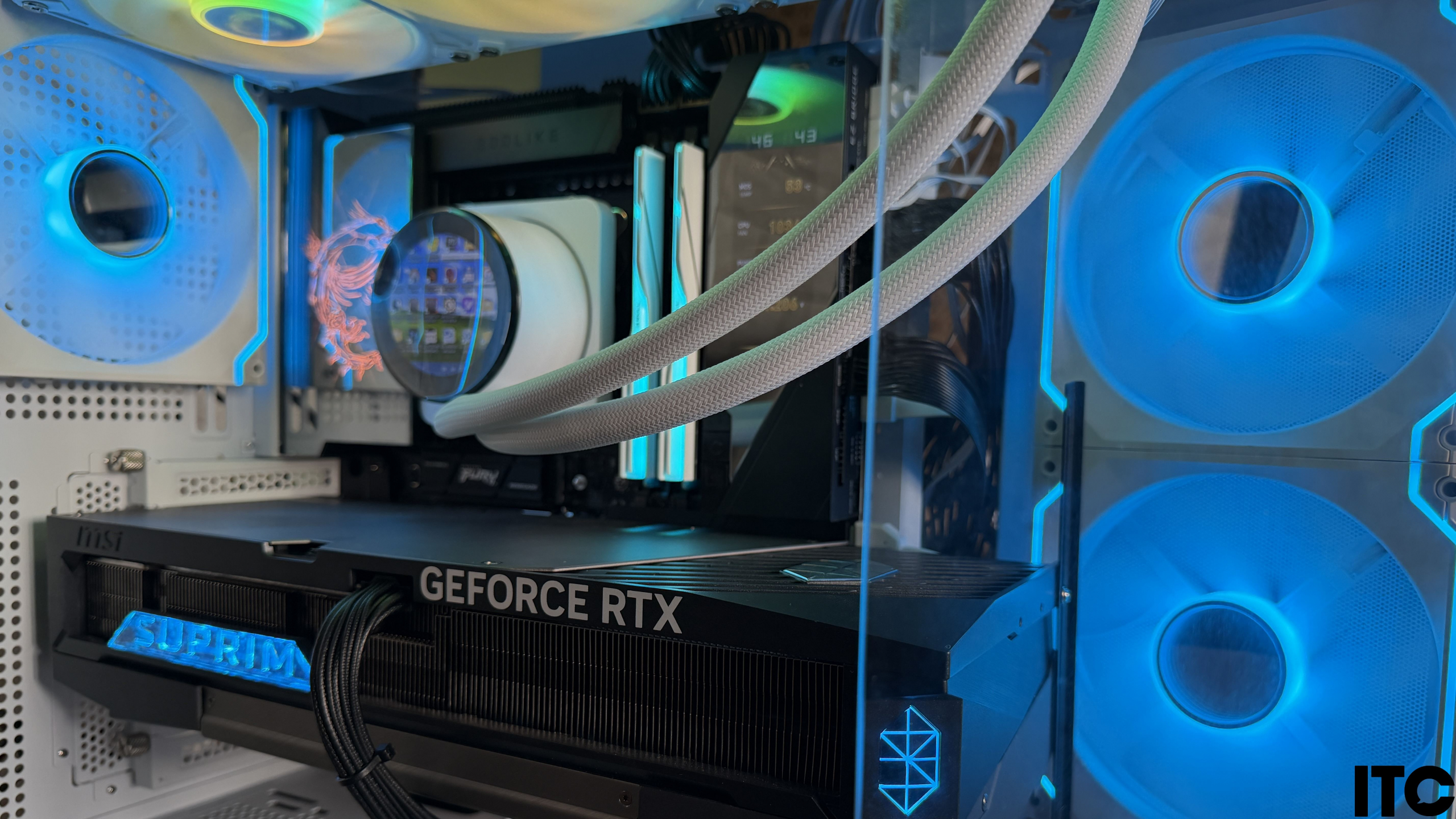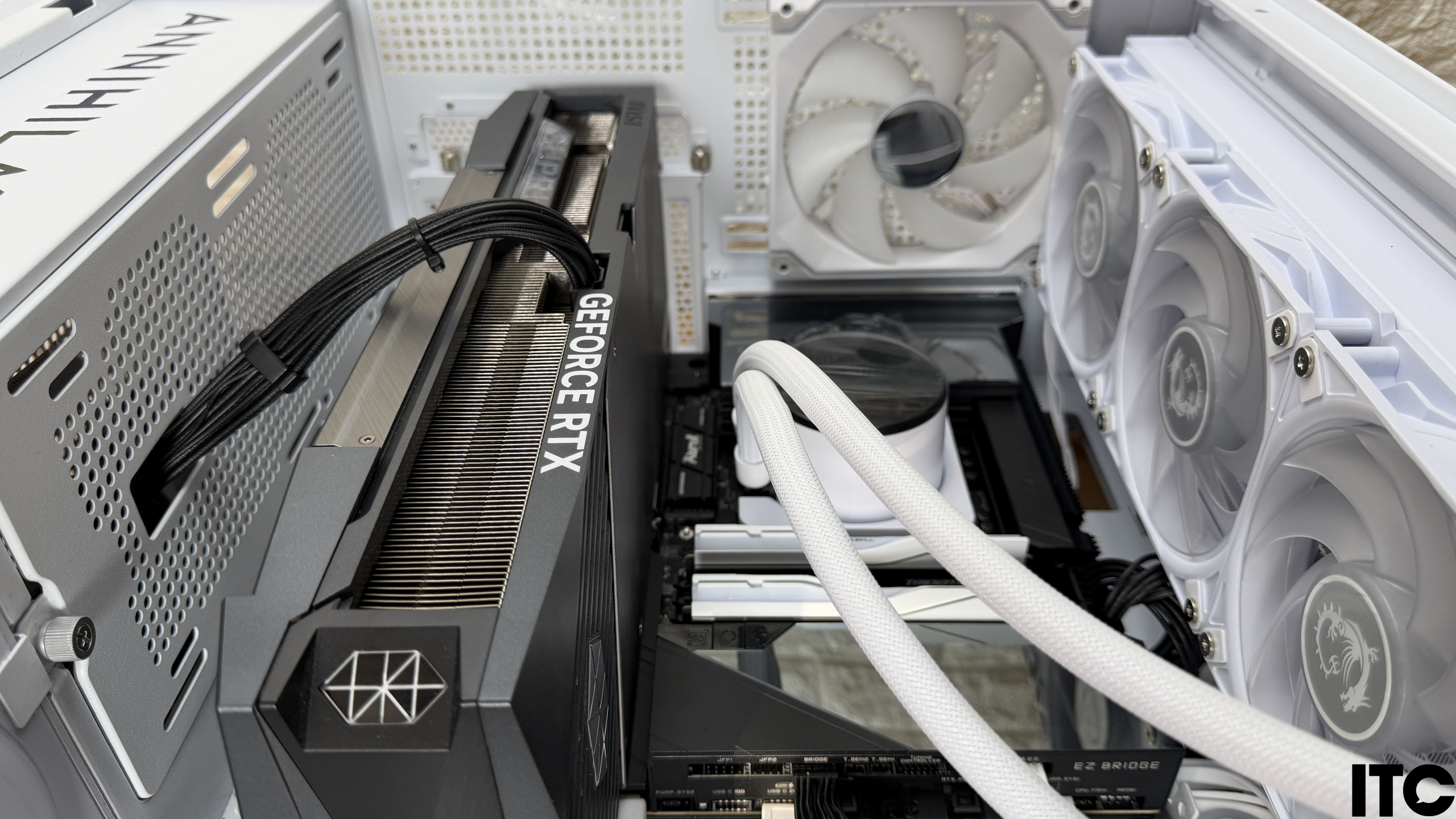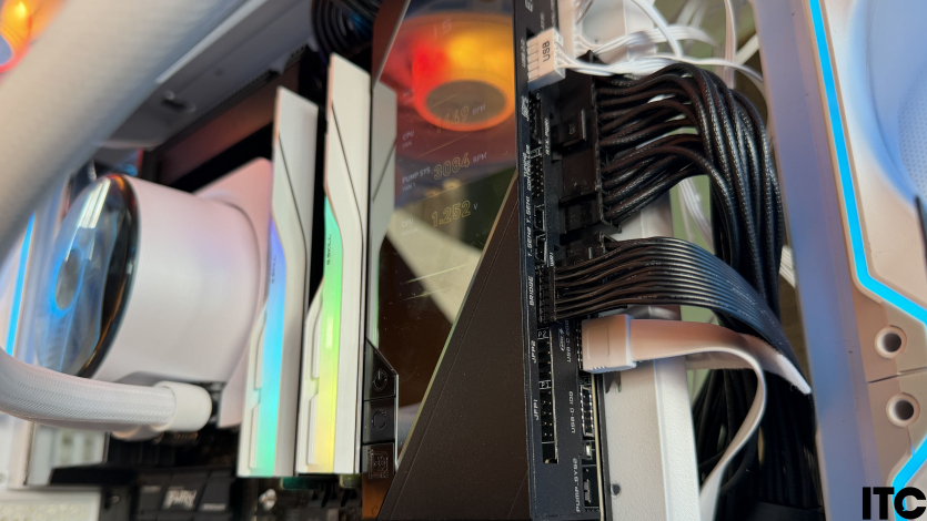 При сборке «ПК за $10К» на базе MSI MEG X870E Godlike X Edition пришлось изрядно повозиться. Это первая материнская плата формата E-ATX, которая не поместилась в корпус Cougar FV270 RGB WHITE без небольших вмешательств в его конструкцию. Мешал специальный кожух, который прикрывал соединение. Его пришлось временно демонтировать на момент тестов, что, естественно, отразилось на общей эстетике системы