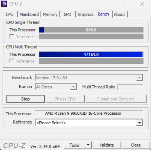 В тесте CPU-Z процессор Ryzen 9 9950X3D (режим PBO) на MSI MEG X870E Godlike X Edition в однопоточной производительности набрал 895 баллов, что похоже на результаты конкурента от Intel — Core Ultra 9 285K с его 909 баллами на топовой материнской плате MSI MEG Z890 ACE. В многопоточном режиме AMD заработал 17 151 балл с разницей в 10% в пользу «синих».