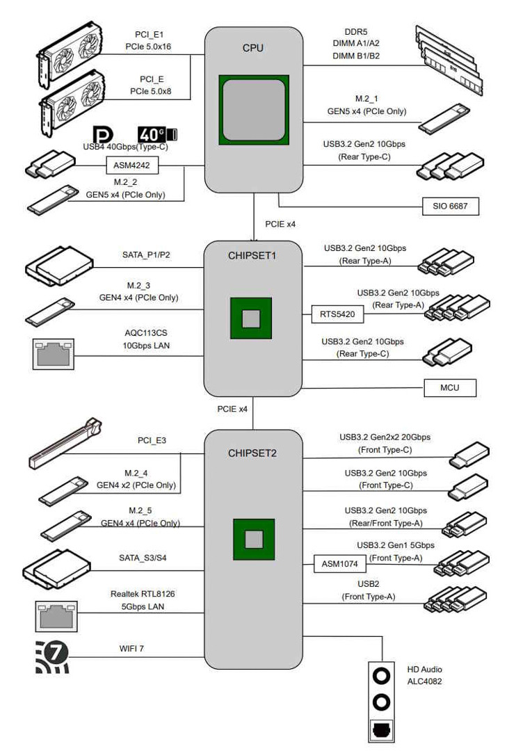 - 2 x M.2 PCIe Gen 5 x4 от CPU (128 Гбит/с);