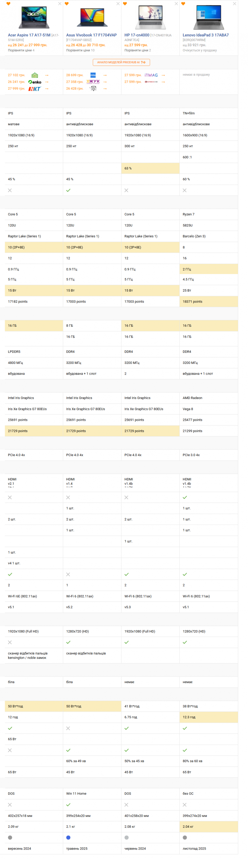 Рядом стоит Asus Vivobook 17 F1704VAP — тот же Core 5 120U, но с DDR4 и более слабой базовой конфигурацией (часто 8 ГБ ОЗУ) от 26 428 гривен. Acer Aspire A17 выглядит более сбалансированным из коробки.