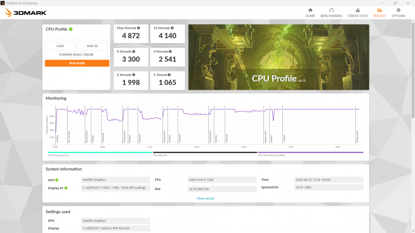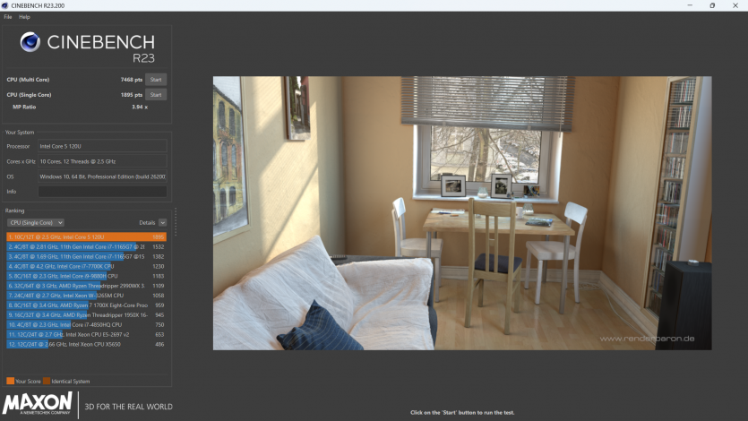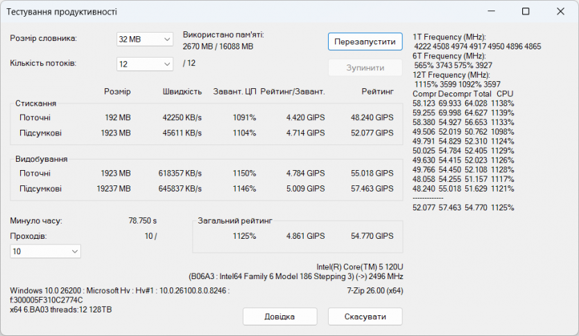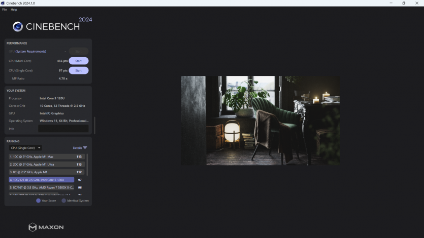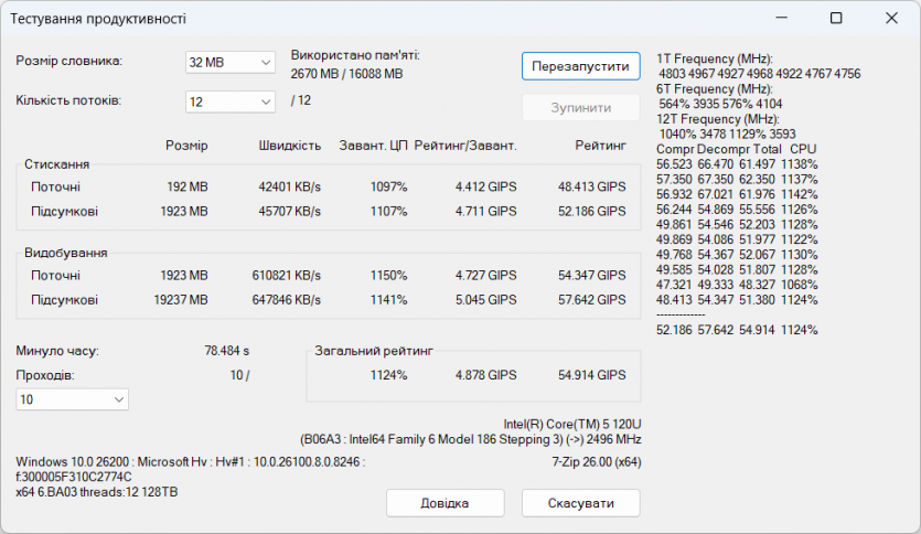 По сравнению с i5-1335U более новый 120U обеспечивает чуть лучшую отзывчивость в однопоточном и смешанных сценариях, тогда как в многопоточном режиме разница минимальная и часто сводится к особенностям охлаждения и лимитам мощности. Против Ryzen 5 7530U ситуация остается близкой к паритету: Intel быстрее реагирует в коротких задачах, тогда как AMD иногда стабильнее держит длительную нагрузку.