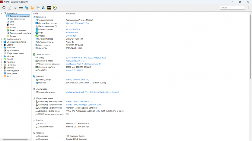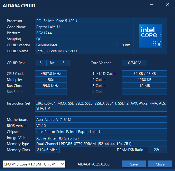 Если смотреть шире, то Core 5 120U в этой конфигурации Acer Aspire A17 по ощущениям может напоминать десктопный Intel Core i5-12400 в легких повседневных задачах, но с заметным отставанием в длительных многопоточных нагрузках из-за более низкого теплопакета и ограничения энергопотребления.