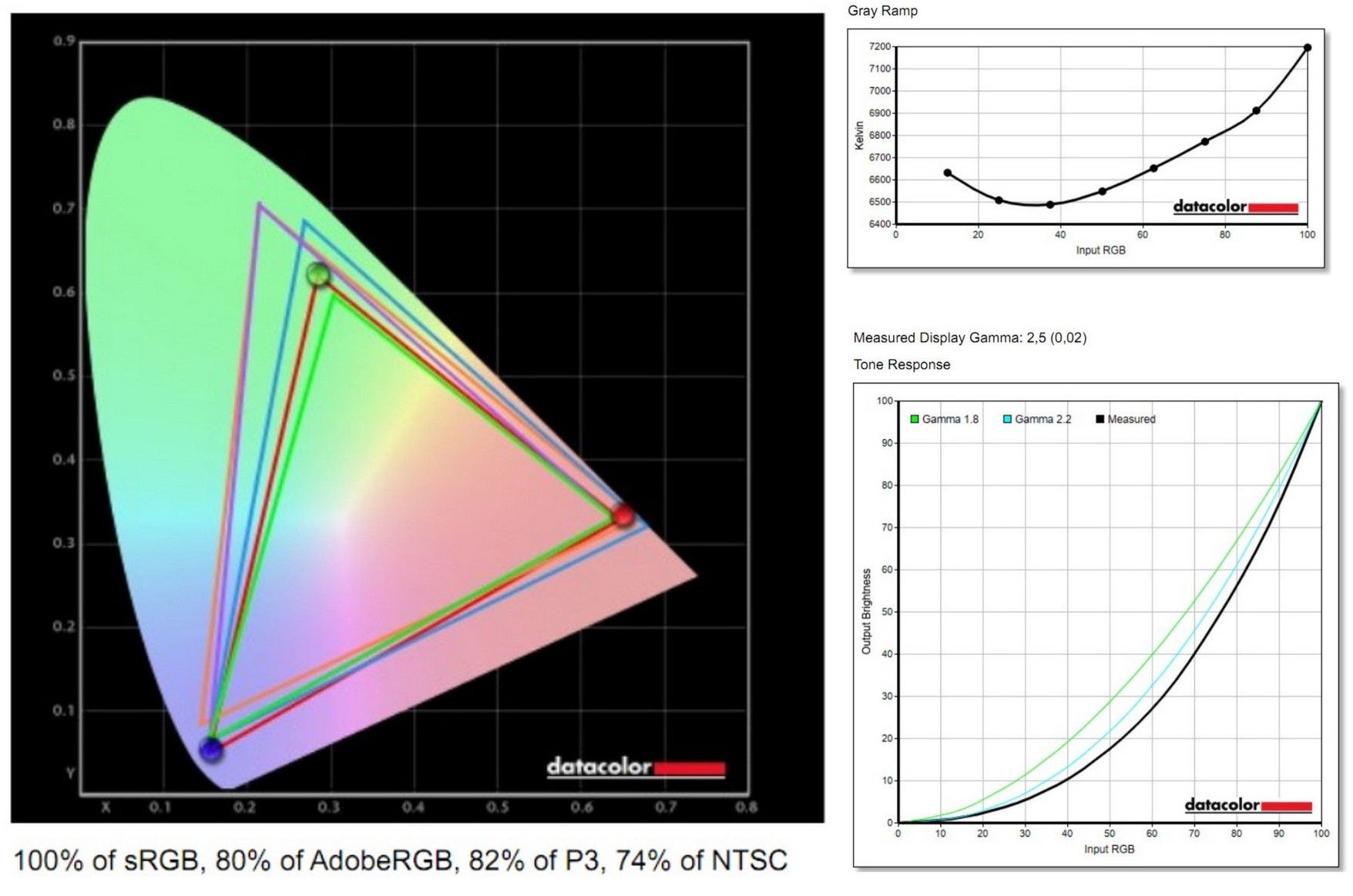Цветовая гамма немного завышена (2.5) по сравнению со стандартным значением — 2.2. С ростом яркости экрана цветовая температура поднимается в более холодный спектр, вплоть до значения 7200K при 100%. Самый точный показатель наблюдается на интервале 25-40% яркости