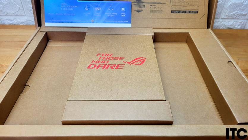 Внешне заводская коробка ASUS ROG Strix G16 (G615JH-RV082) не особо отличается от типичных ноутбуков. Однако при ее открытии появляются первые признаки премиальности. Ноутбук поднимается на импровизированном постаменте. Внутренняя сторона демонстрирует дизайнерскую стилизацию под рисунок карандашом, где изображен герой нашего обзора, плюс некоторые элементы его системы охлаждения и экстерьера.