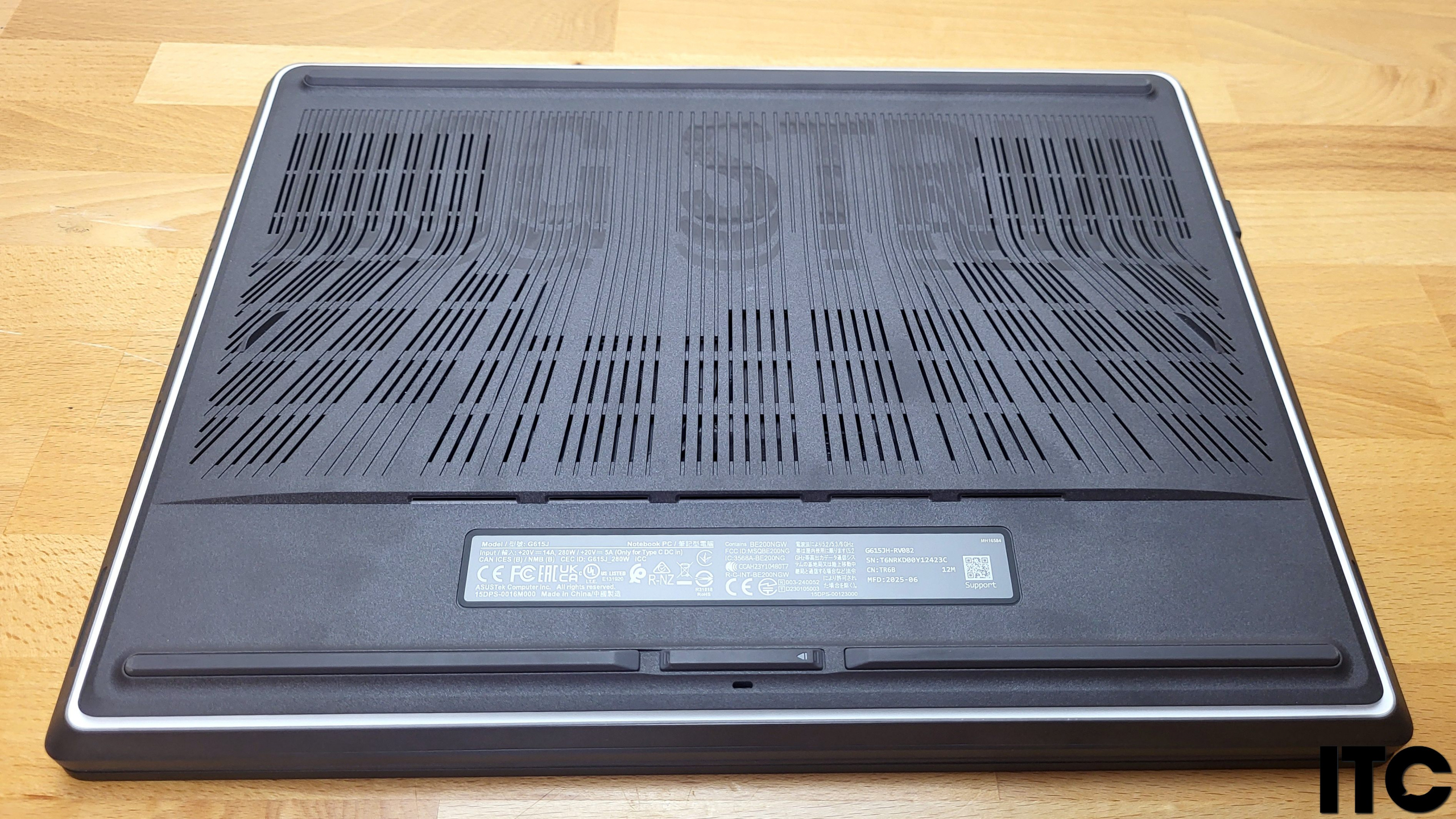 Петли ASUS ROG Strix G16 не только выглядят массивными, но и достаточно прочные. Ноутбук легко открывается одним пальцем без дополнительной фиксации. Решетки системы охлаждения занимают всю нижнюю тыловую поверхность.