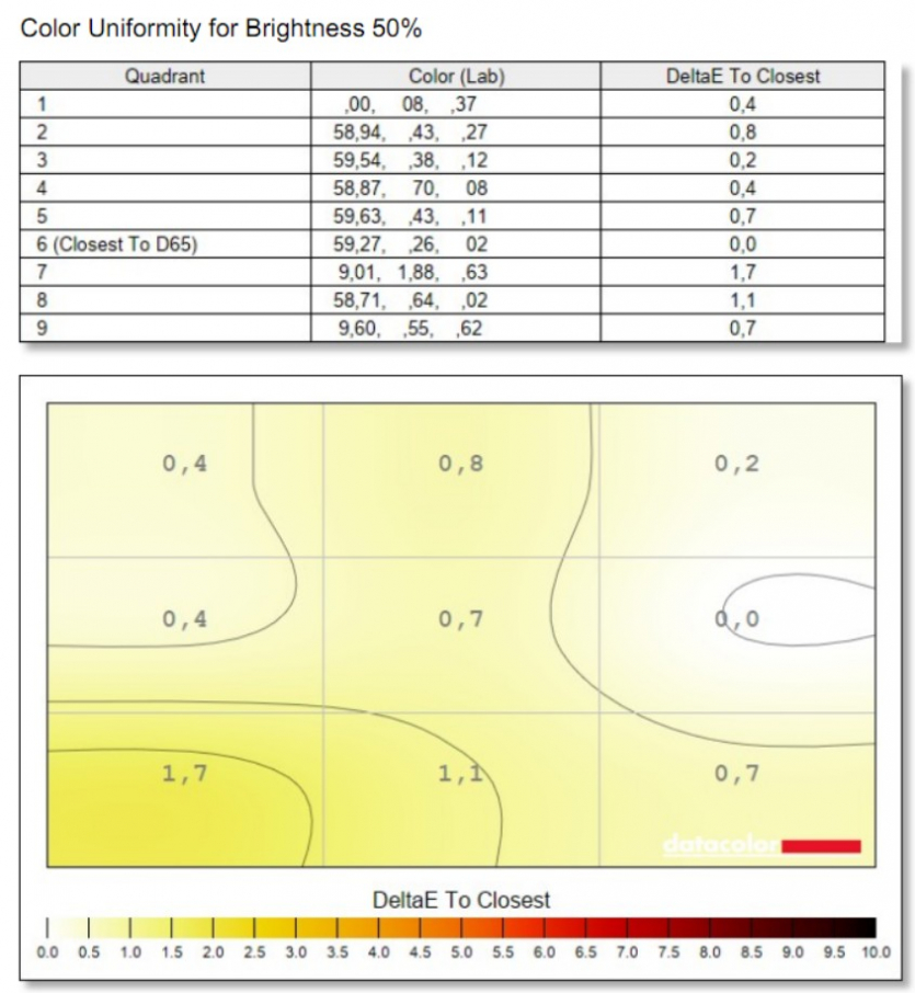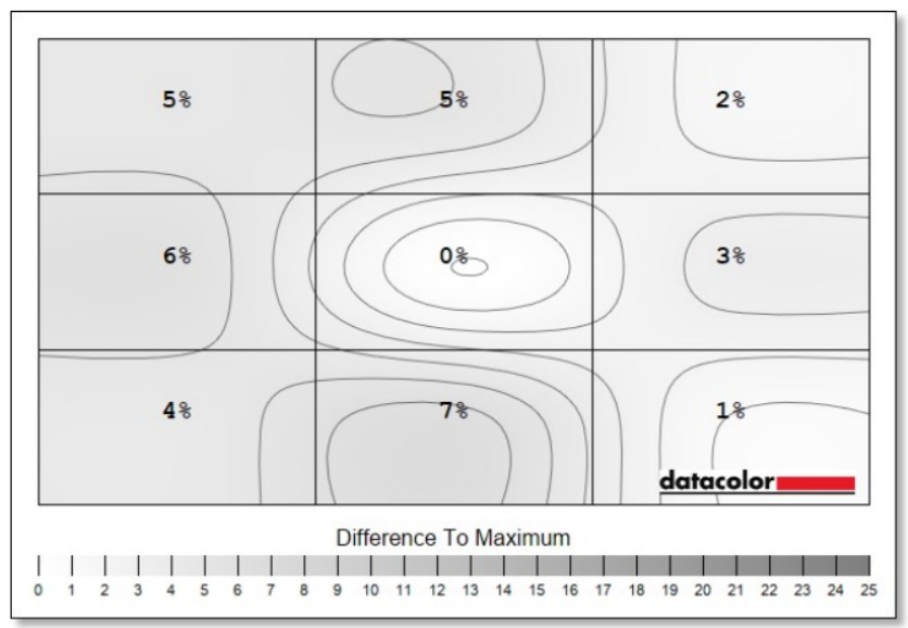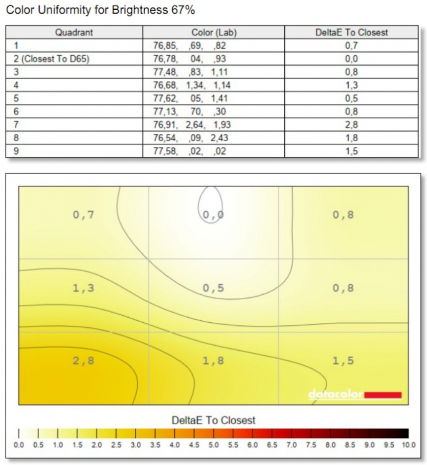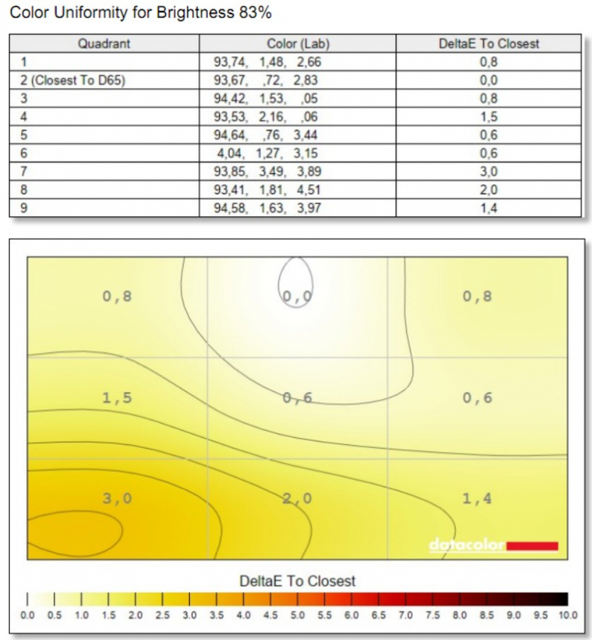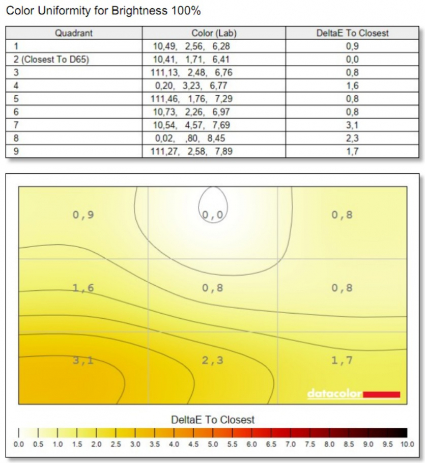 Контрастность на уровне 1170 — хорошая, как для IPS матрицы с LED подсветкой. Так же колориметр сигнализирует об удачных показателях равномерности цветовой температуры (максимальная Delta E=3.1) и белого поля (7% Max) при 100% яркости.