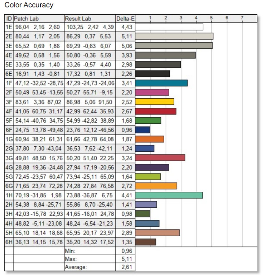 Что касается соответствия цветов, то средняя Delta E=2.61 с максимальным значением — 5.1. Неплохой результат для непрофессиональной обработки фото или видео и мультимедийного досуга