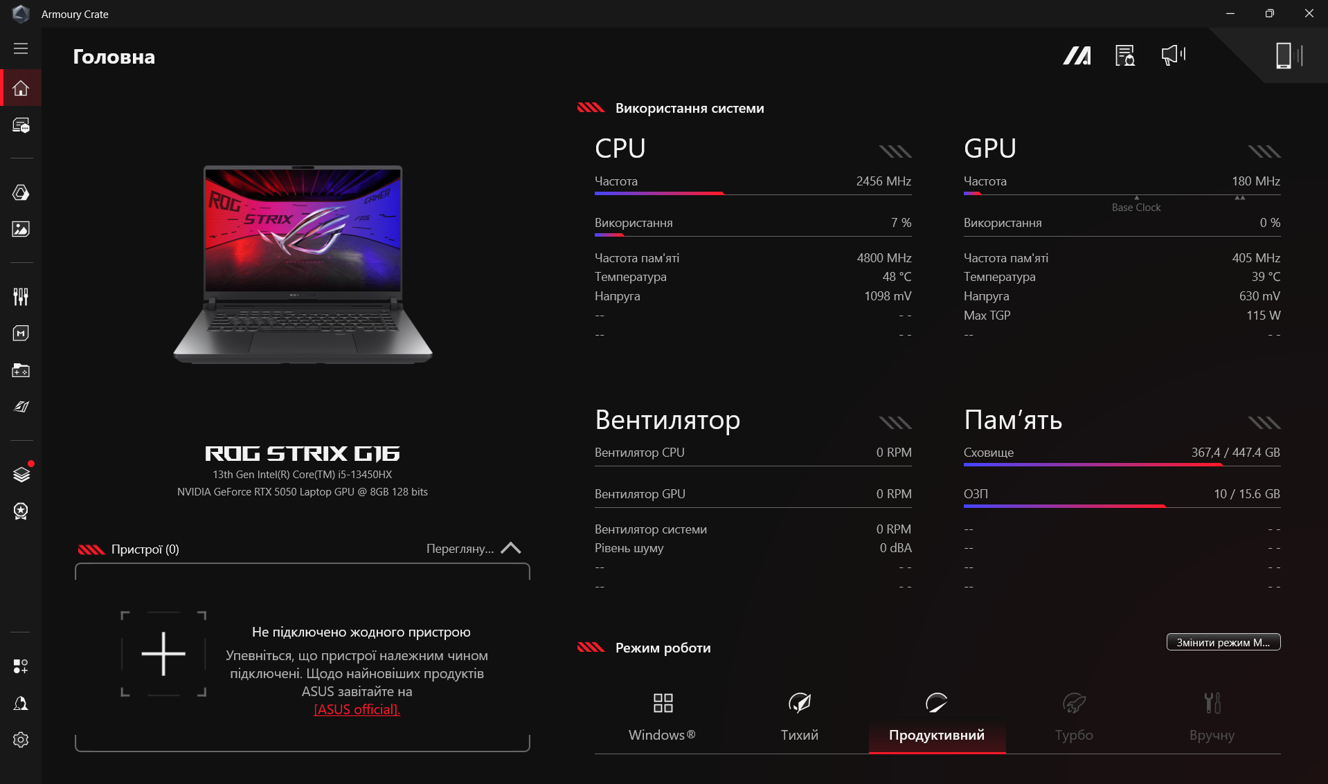 Центральным инструментом для управления ASUS ROG Strix G16 (2025) является Armoury Crate — фирменная утилита. Программа служит единым местом для контроля всех ключевых параметров ноутбука: режимов производительности, RGB-подсветки, охлаждения, мониторинга и еще многих функций.