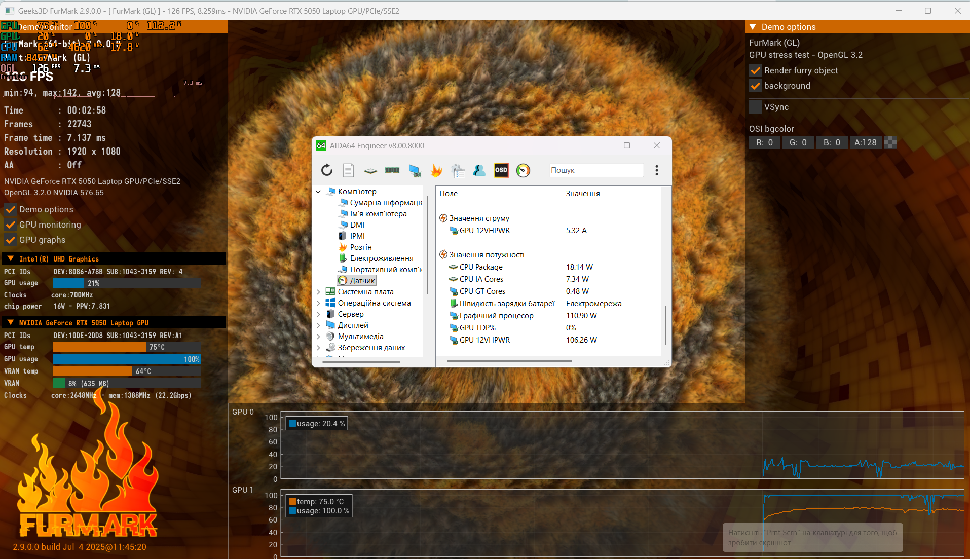 В самом производительном режиме максимальные показатели не превышали 78 градусов по Цельсию на центральном процессоре и 76 °C на RTX 5050. При этом шум оставался в комфортных значениях, не выходя за рамки 44 ДБа.