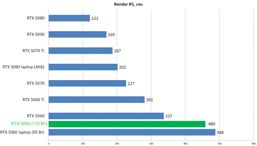 В Blender NVIDIA RTX 5050 несущественно уступает более старшей RTX 5060 с TGP 95 Вт которая производительнее всего примерно на 10%. Большое значение здесь играет именно количество доступных ватт, которых в пике — 115. Это делает RTX 5050 до 20% быстрее версии с урезанным до 45 Вт лимитом.