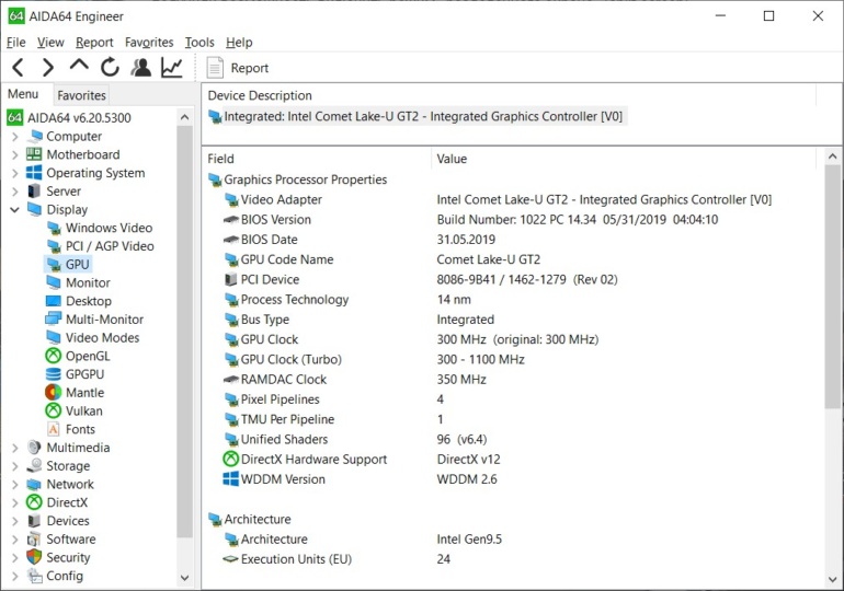Процессор оснащен графическим ядром Intel UHD Graphics. Хотя в этом случае производитель не использует определенное обозначение модели видеоядра, в плане возможностей это аналог UHD 620 с архитектурой Intel Gen9.5. В данном случае имеем 24 исполнительных модуля (EU), работающих на частоте 300/1100 МГц.