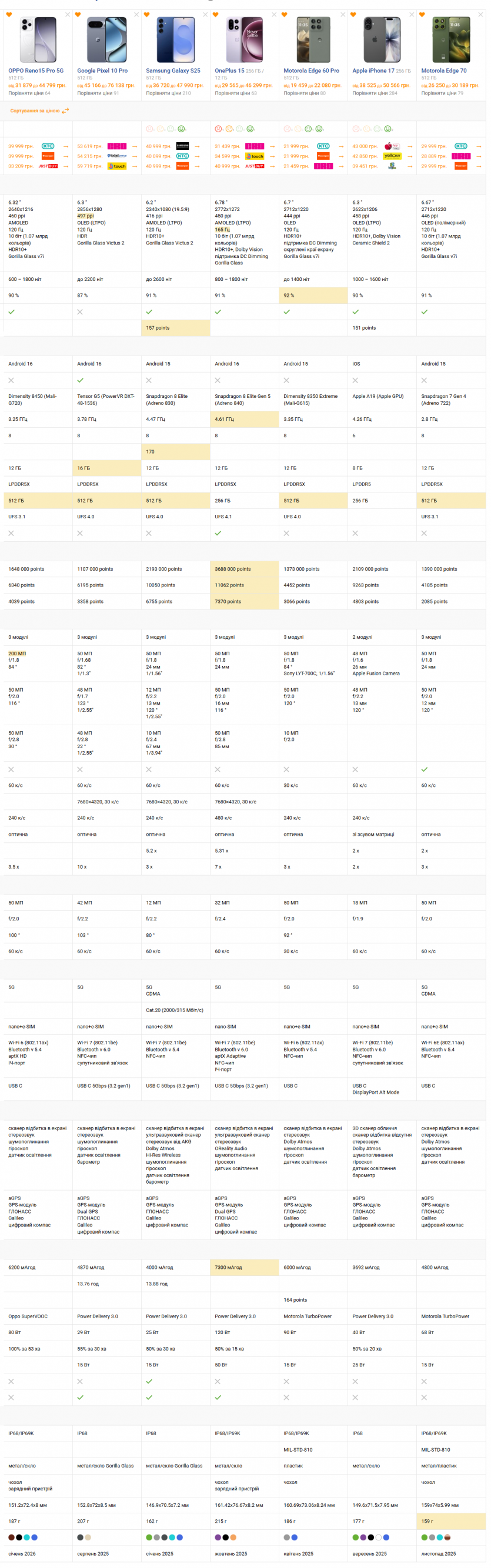 Samsung Galaxy S25 512 ГБ стоит от 36 720 до 47 990 гривен. Более мощный, но менее автономный. OnePlus 15 256 ГБ доступен за 29 565-46 299 гривен. Motorola Edge 60 Pro 512 ГБ стоит от 19 459 до 22 080 гривен. Процессор и камера немного слабее, чем у OPPO Reno15 Pro.