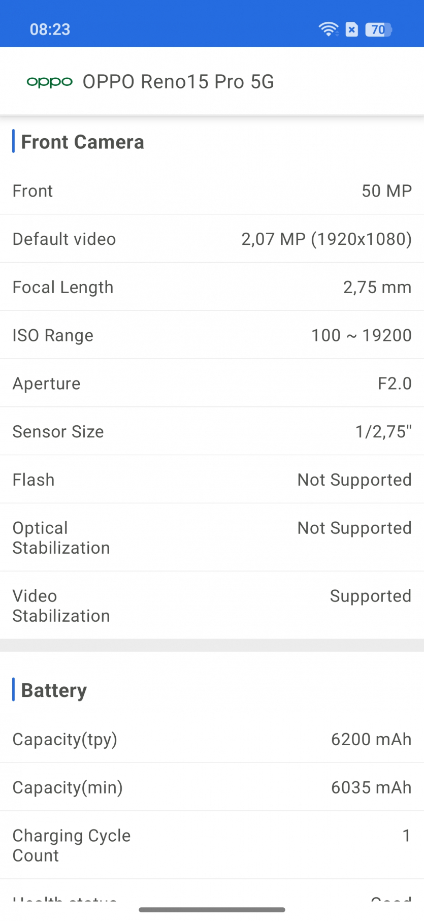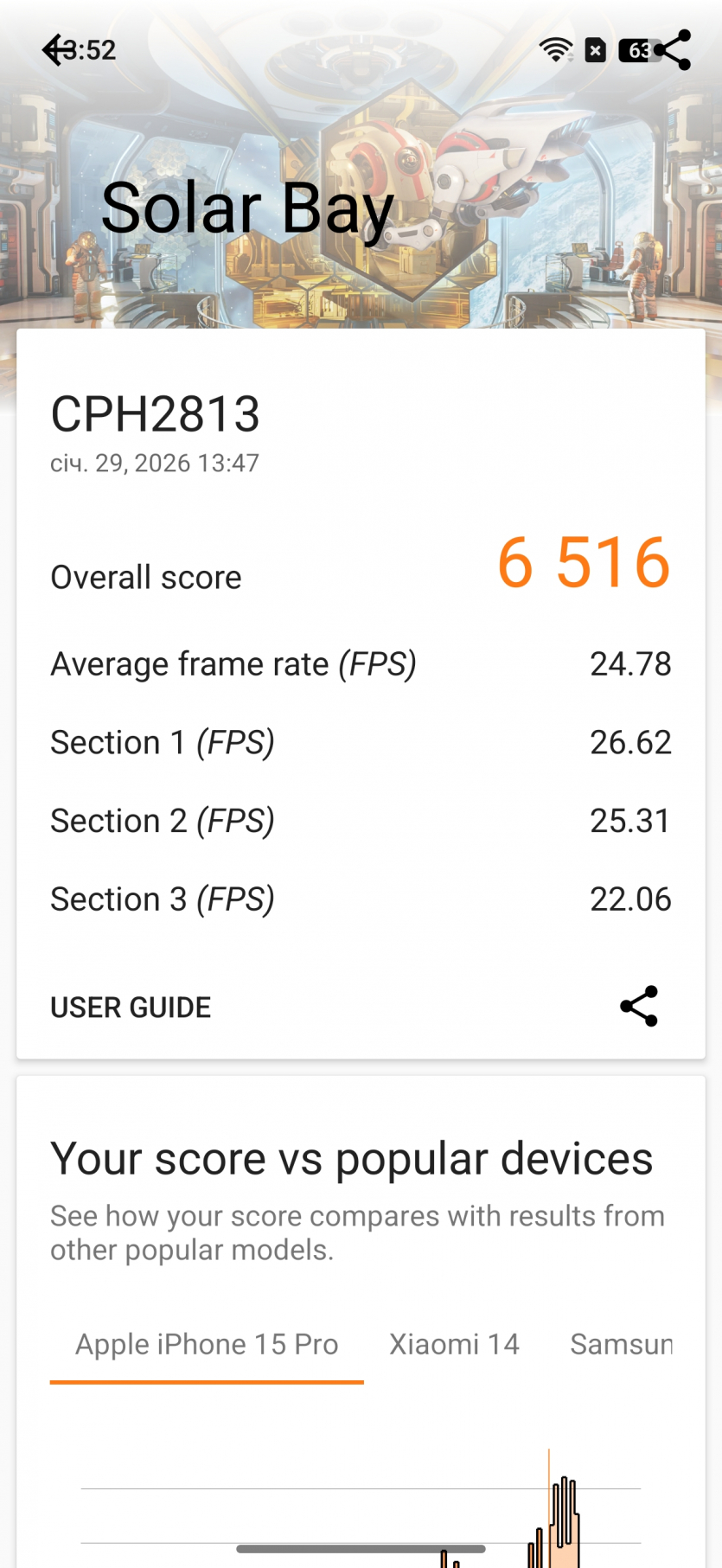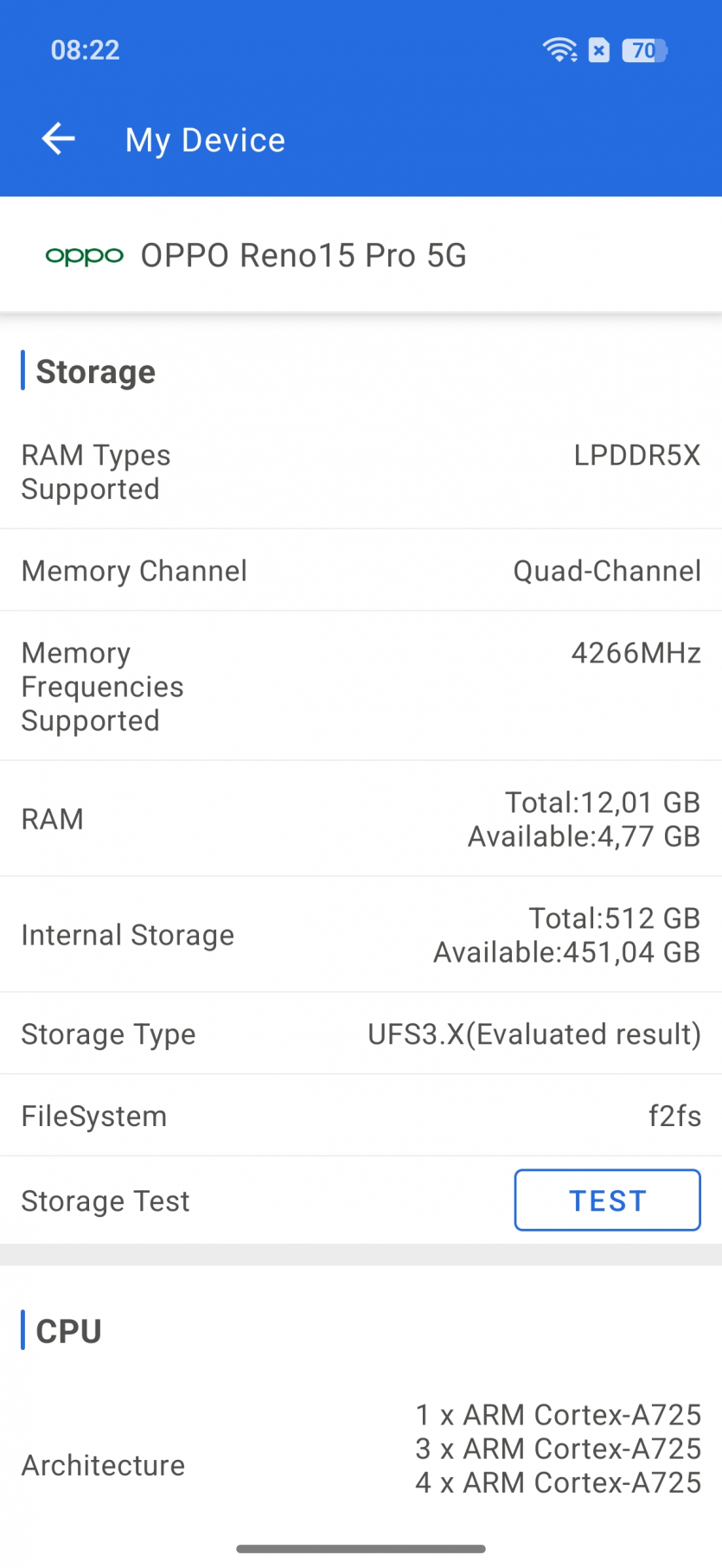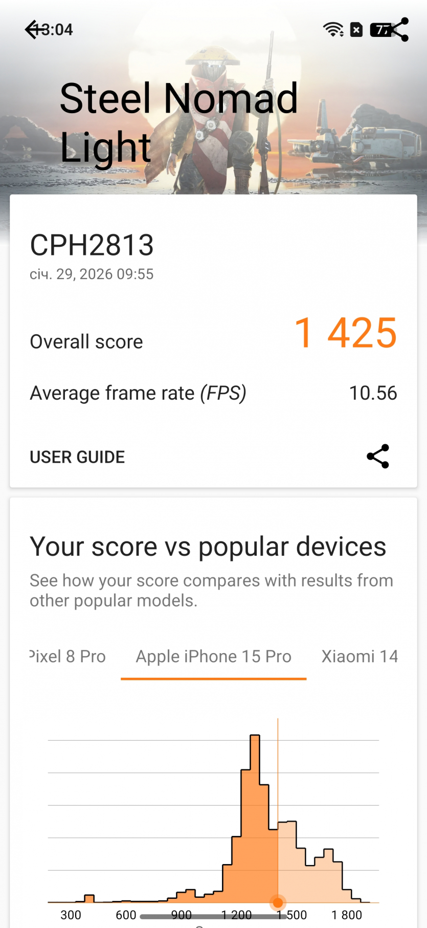 Распределение энергопотребления работает эффективно: энергоэффективные ядра Cortex-A55 выполняют большинство легких задач, а мощные Cortex-A78 включаются только при необходимости, благодаря чему Reno15 Pro не становится горячим при повседневном использовании.