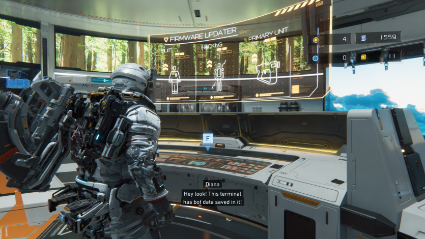Между боями игра дает передохнуть, и тут нам пригодится убежище. Это твой хаб, где можно немного перевести дыхание и подготовиться к следующим схваткам. Также здесь происходит прокачка. Ты развиваешь Диану, открываешь новые возможности для хакинга, усиливаешь Хью и настраиваешь стиль игры под себя. Здесь же происходит и создание оружия. Его буквально печатаешь из ресурсов, которые находишь во время прохождения.
