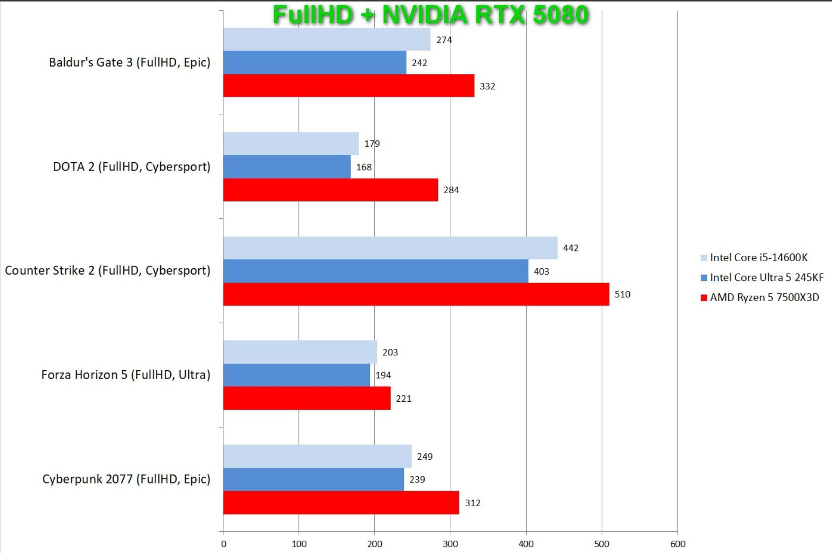 | Бенчмарк: | Core Ultra 5 245K | Ryzen 7 9700X | Core i5 14600k | Ryzen 5 7500f | Ryzen 5 7500X3D |