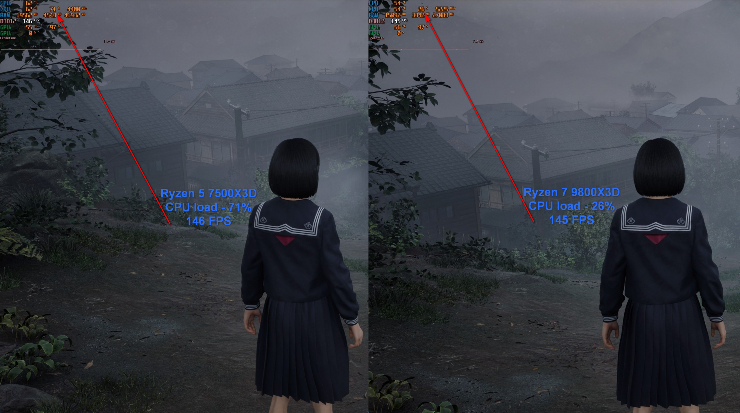 Единственную разницу в обычных играх между этими двумя CPU можно заметить разве, что в степени их загруженности. Например в Silent Hill f оба демонстрируют одинаковый FPS, хотя там где Ryzen 5 7500X3D работал на 71%, Ryzen 7 9800X3D — всего лишь на 28%. Тут уже сказывается количество ядер/потоков, частота и новая архитектура.
