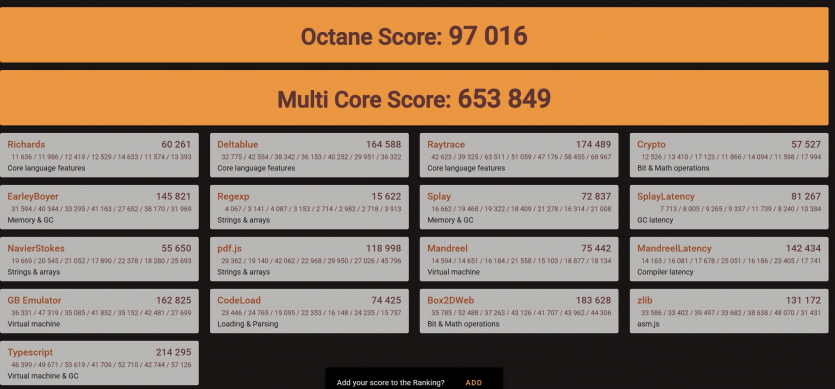 Read — 58 880 Write — 80 902 Copy — 55 695 Latency — 75.3 Single — 2 189 Multy — 22 145 |