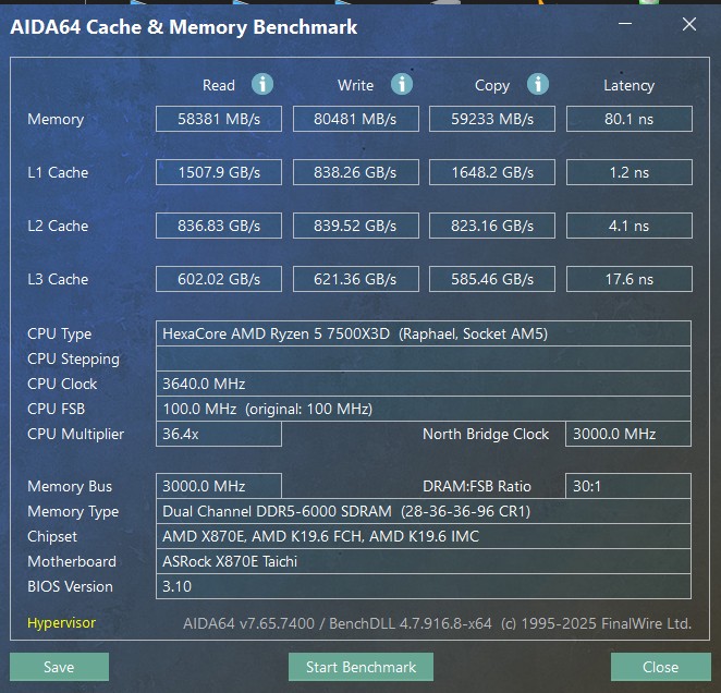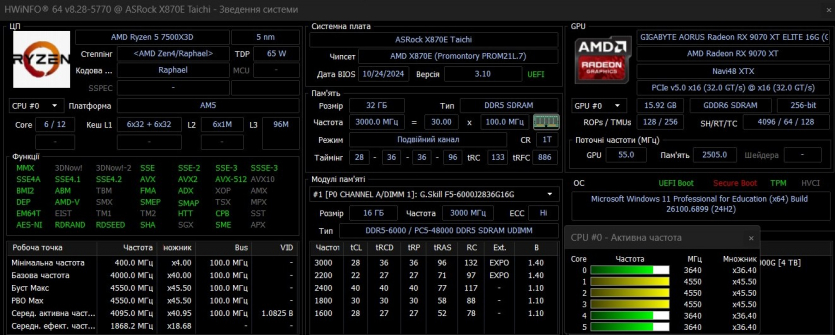 AMD Ryzen 5 7500X3D тестировался на топовой AM5 материнской плате ASRock X870E Taichi. Для корректной работы CPU производитель рекомендует использовать версию BIOS AGESA 1.2.0.3f.