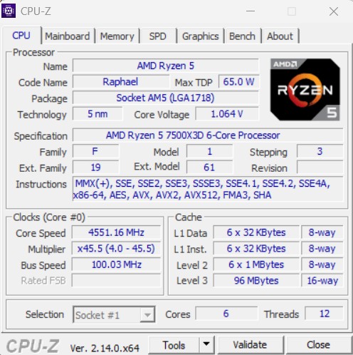Ryzen 5 7500X3D построен на архитектуре Zen 4 предыдущего поколения. Он оснащен шестью ядрами и 12 потоками с тактовой частотой до 4,5 ГГц, которая на 200 МГц ниже предшественника. Объем кэша L3 не изменился и составляет те же самые 96 МБ.