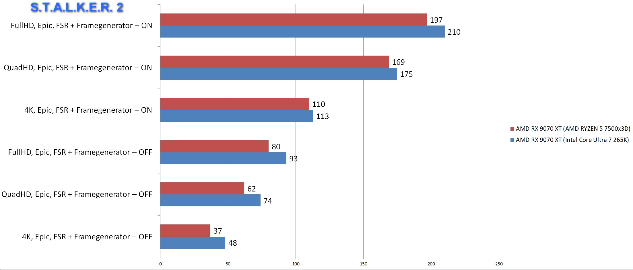 S.T.A.L.K.E.R 2 лучше воспринимает количество и частоту ядер, чем объем L3 кэша. Ради любопытства я сравнил FPS с более дорогим Intel Core Ultra 7 265K. Разница особенно заметна в режиме классической растеризации без включенного суперсемплинга и генератора кадров, которые «размывают» отставание.