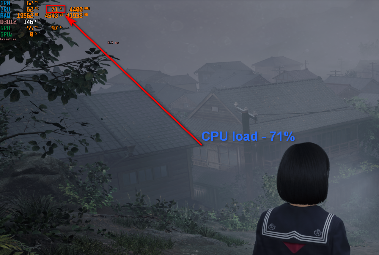В Silent Hill f никаких проблем не наблюдалось, хотя игра загружала процессор до 70%. Пока что 6 ядер и 12 потоков хватает, но, как видим, даже не нужно смотреть далеко за горизонт, чтобы заметить тенденцию все больших требований к CPU со стороны современных игр.
