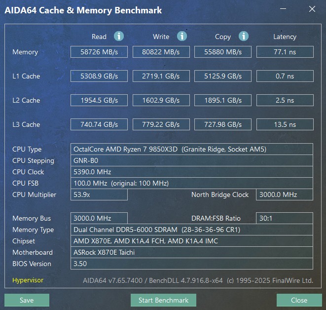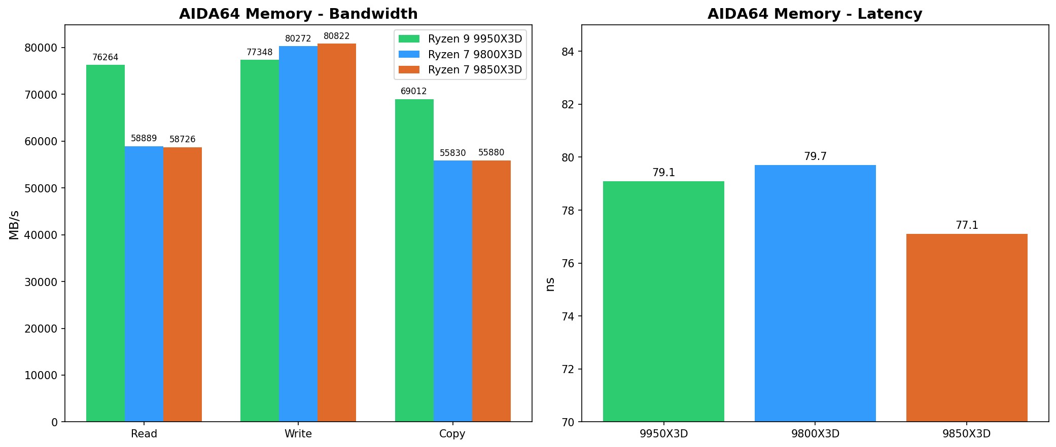 В тесте памяти AIDA64 показывает практически идентичные результаты для обоих процессоров. Скорость чтения составляла 58726 МБ/с у 9850X3D и 58889 МБ/с у 9800X3D, скорость записи — 80822 и 80272 МБ/с соответственно. Латентность памяти у новинки оказалась даже чуть лучше: 77.1 нс против 79.7 нс, что позитивно влияет на производительность в некоторых играх.