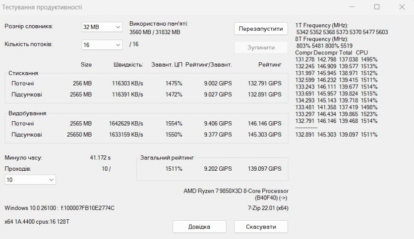 Архиватор 7-zip традиционно хорошо масштабируется с количеством ядер, поэтому здесь 9850X3D показал лишь умеренный прирост. Скорость компрессии составила 132891 GIPS против 131066 у предшественника (+1.4%), декомпрессии — 145303 против 135812 GIPS (+7%). Общий результат составил 139097 и 133439 GIPS соответственно, что дает 4% прироста.