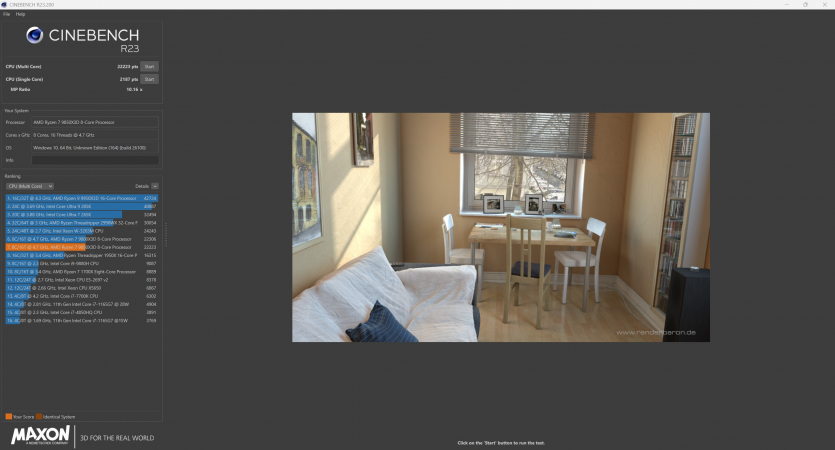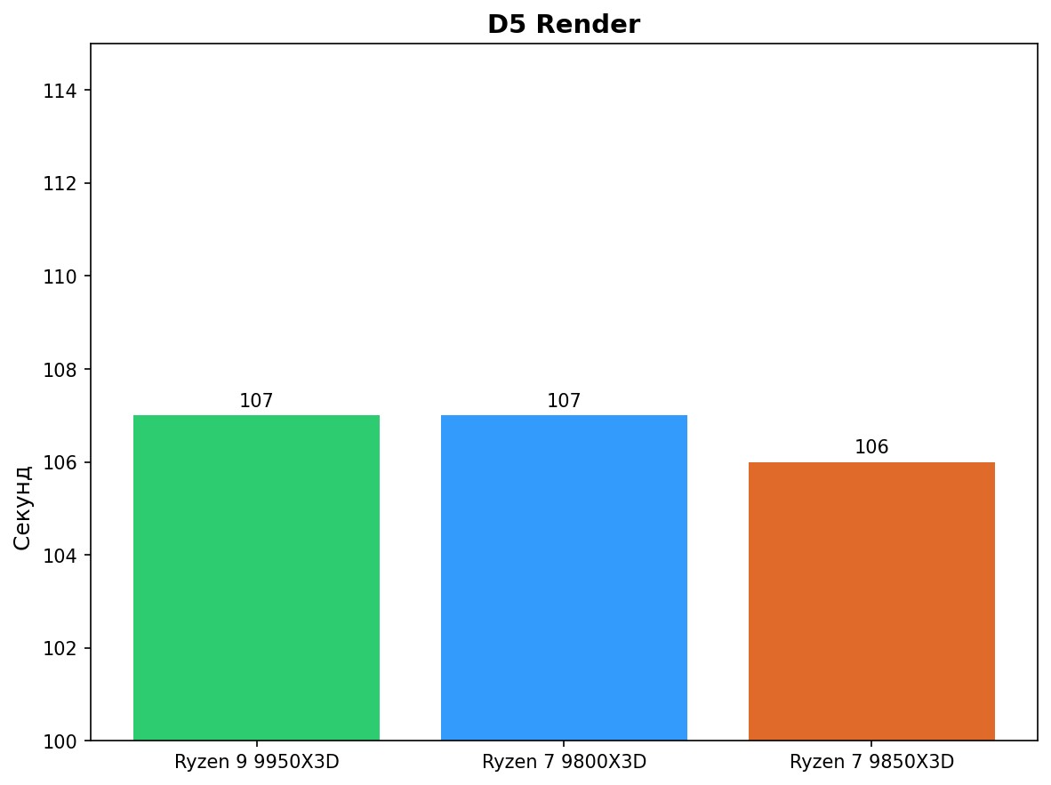 В рендеринге тестовой сцены D5 Render все три процессора показали практически одинаковое время выполнения: 106 секунд у 9850X3D, 107 секунд у 9800X3D. Хоть данный бенчмарк активно использует ресурсы CPU, но такие проекты больше зависят от видеокарты, чем от процессора.