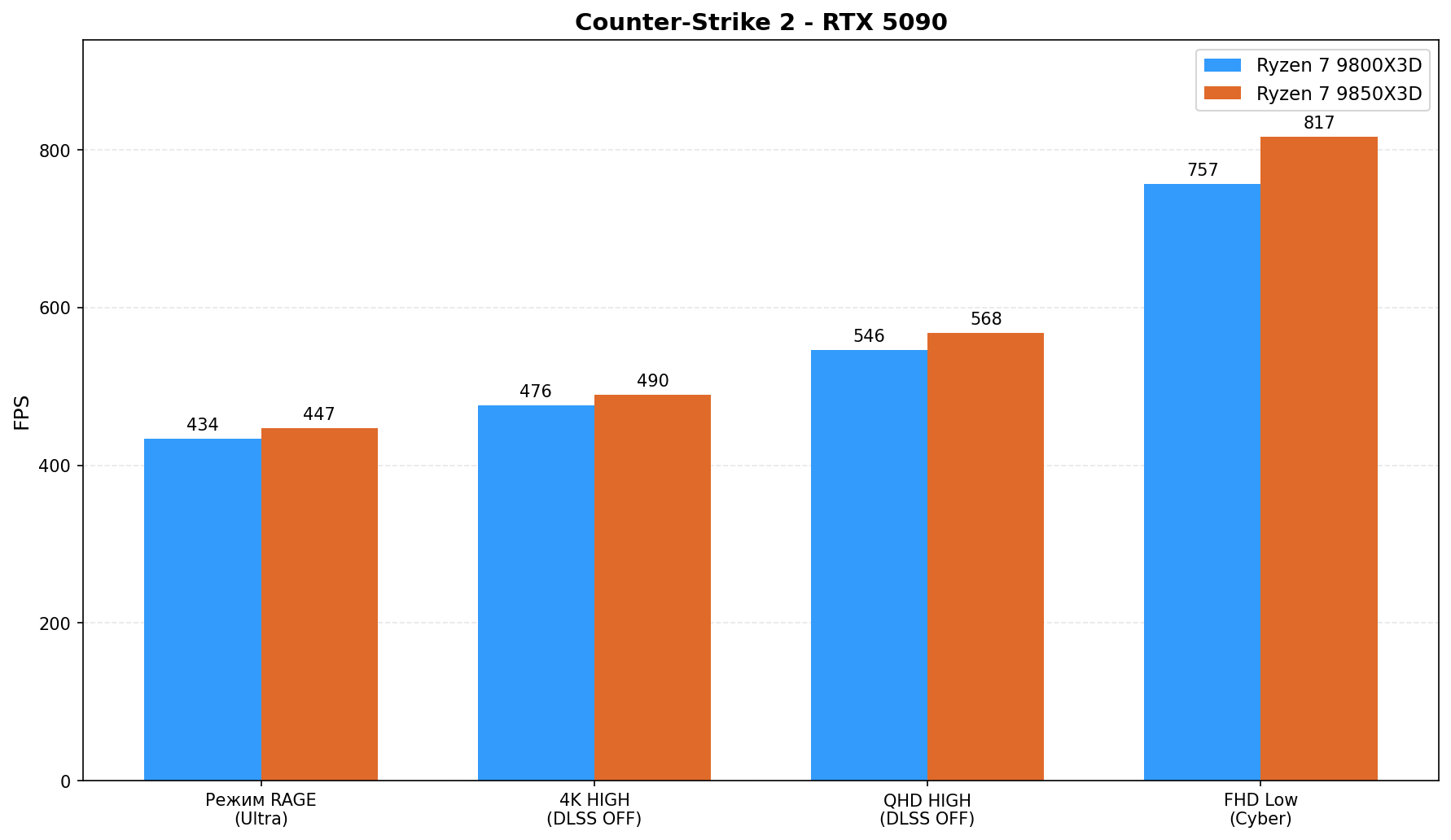 | Counter-Strike 2 (9850X3D) | 447 | 490 | 568 | 817 |