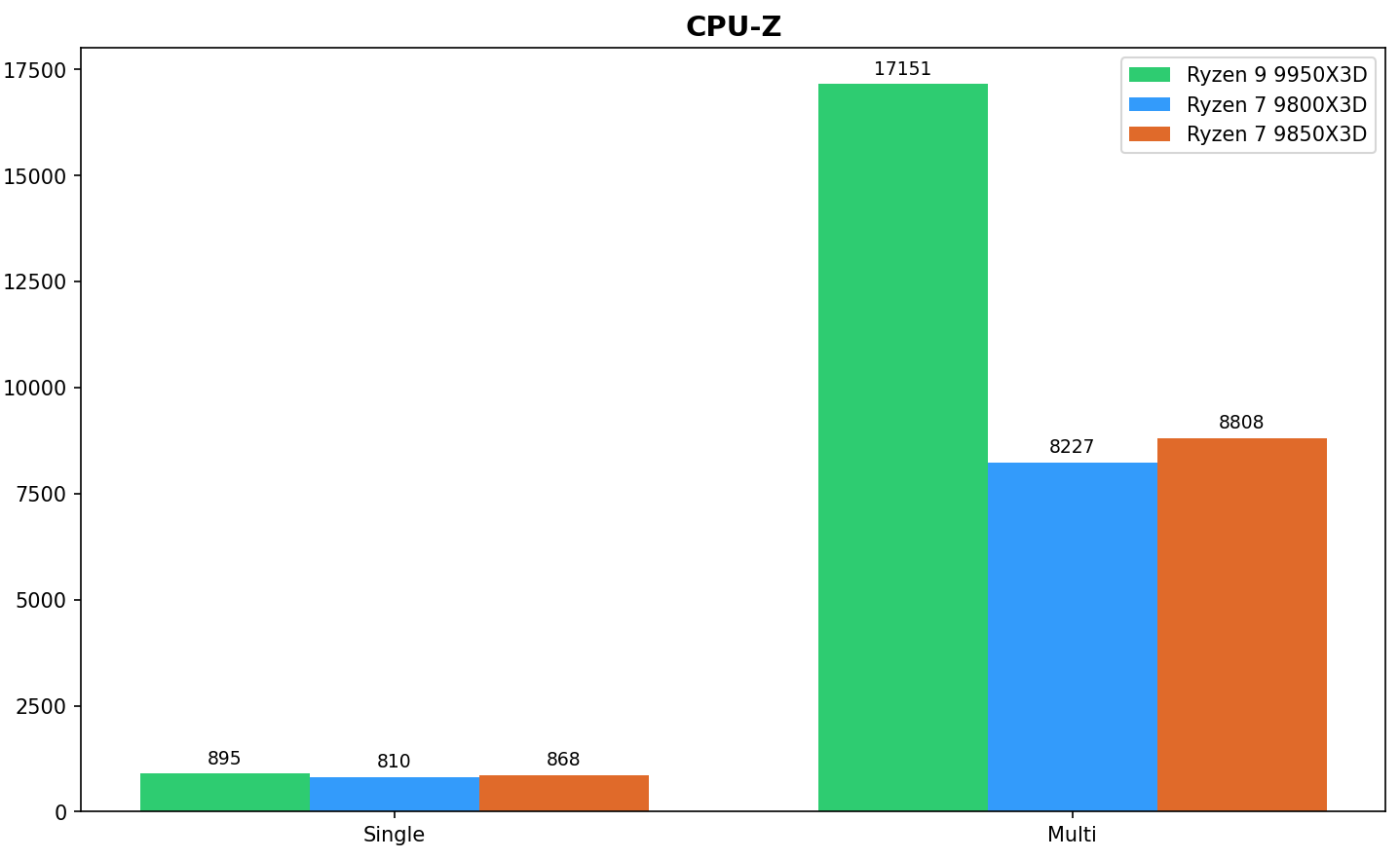 В синтетическом тесте CPU-Z Ryzen 7 9850X3D показал 868 баллов в однопоточном режиме и 8 808 баллов в многопоточном, что на 7% больше 9800X3D. Это «первый звоночек», что AMD удалось эффективно масштабировать архитектуру Zen 5.