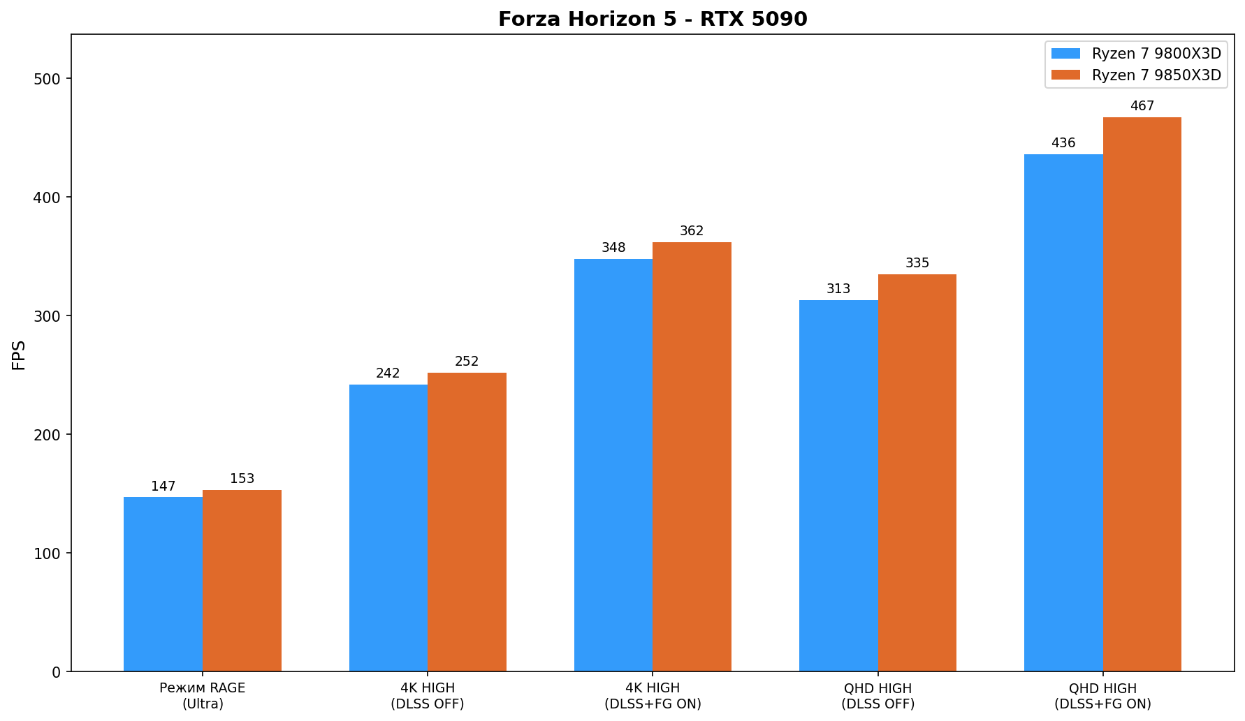 Высокий FPS и низкие задержки особенно почитались любителями стремительных гонок. Здесь Ryzen 7 9850X3D не подвел. Прирост кадров в Forza Horizon 5 колеблется между 4% в 4К до 7% в QuadHD.