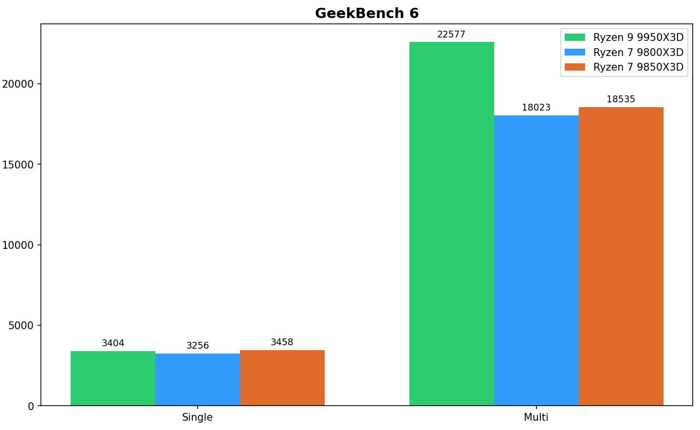 В популярном бенчмарке GeekBench 6 разница оказалась еще более показательной. Ryzen 7 9850X3D набрал 3 458 баллов в однопоточном тесте против 3 256 у предшественника, получив преимущество в 6%. В многопоточном режиме результаты составили 18 535 и 18 023 балла соответственно, со скромным приростом всего в 3%.