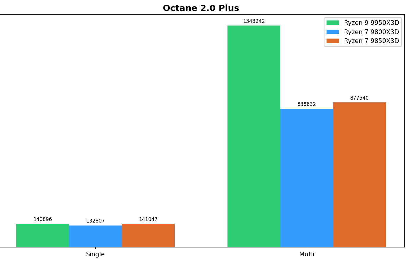 Тест Octane 2.0 Plus подтвердил преимущество 9850X3D в однопоточных сценариях. В Single-режиме новинка набрала 141047 баллов против 132807 у предшественника. В многопоточном тесте результаты составили 877540 и 838632 балла соответственно.