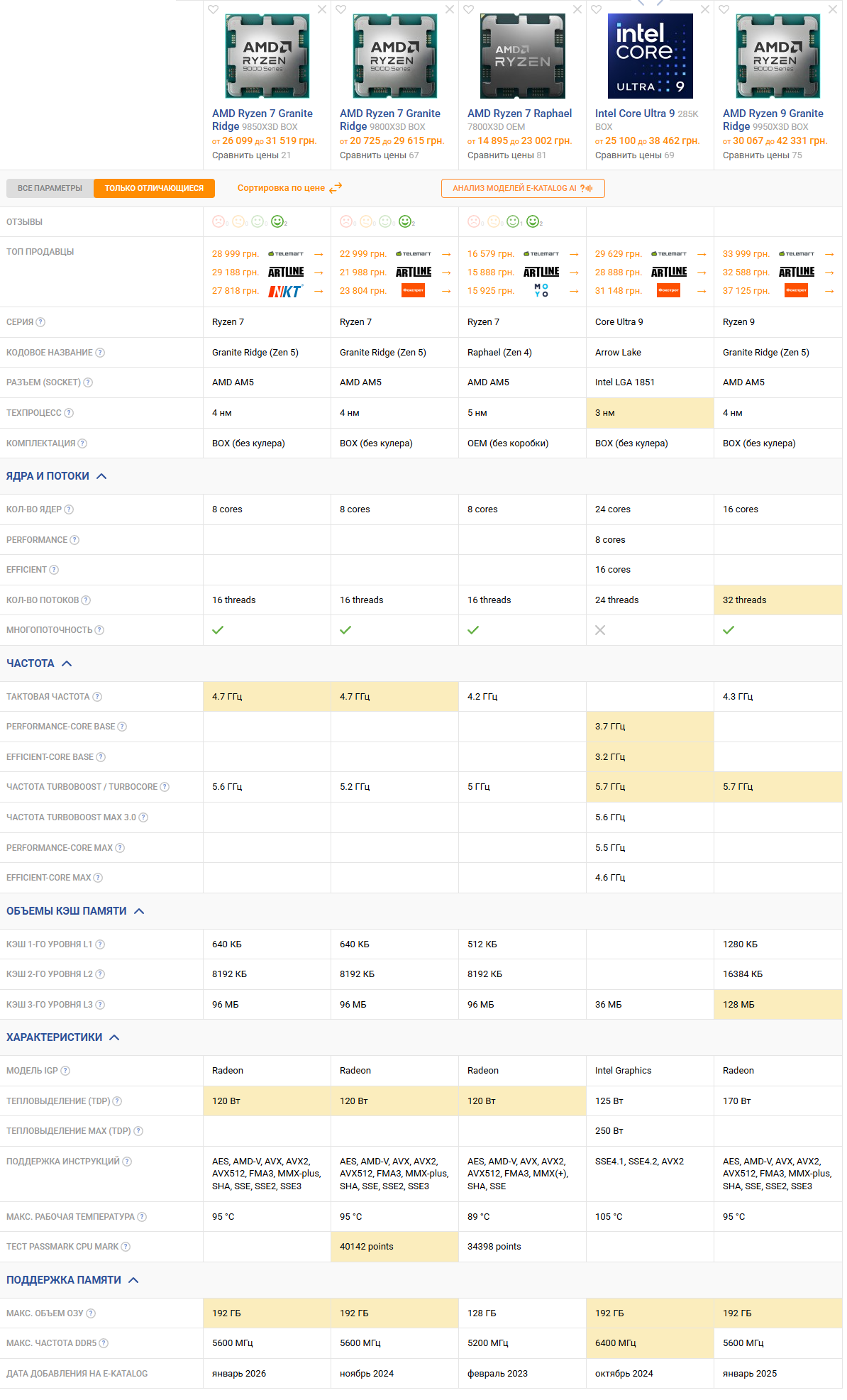 Самый очевидный конкурент — это Ryzen 7 9800X3Dкоторый сейчас продается на 7 000 гривен дешевле. Эта экономия пока вполне оправдана.За схожую стоимость можно приобрести 16-ядерный AMD Ryzen 9 9950X который сейчас стоит на 5000 гривен дороже.