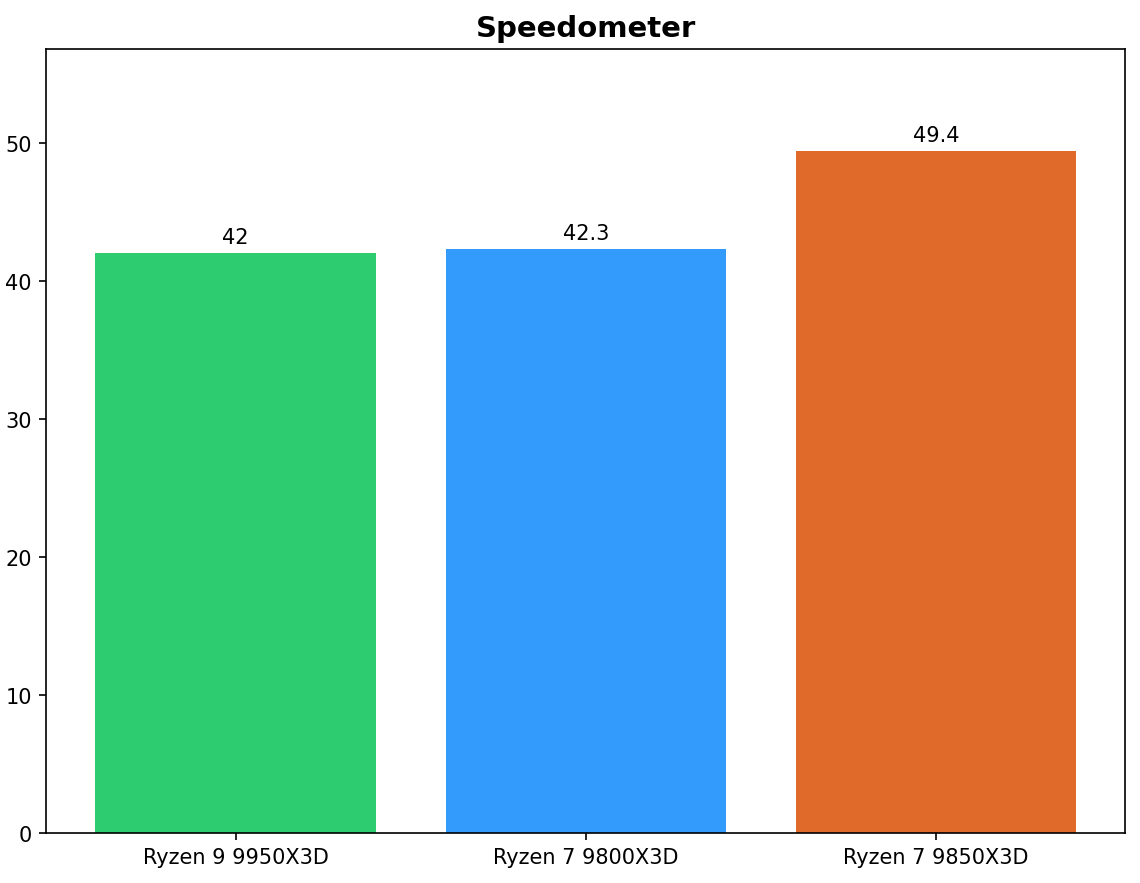 Еще более впечатляющим оказался результат в Speedometer: 49.4 балла против 42.3 у 9800X3D. Это уже настоящая доминация с 17% улучшением, которое объясняется тем, что браузерные тесты активно используют однопоточную производительность и очень чувствительны к латентности кэша.