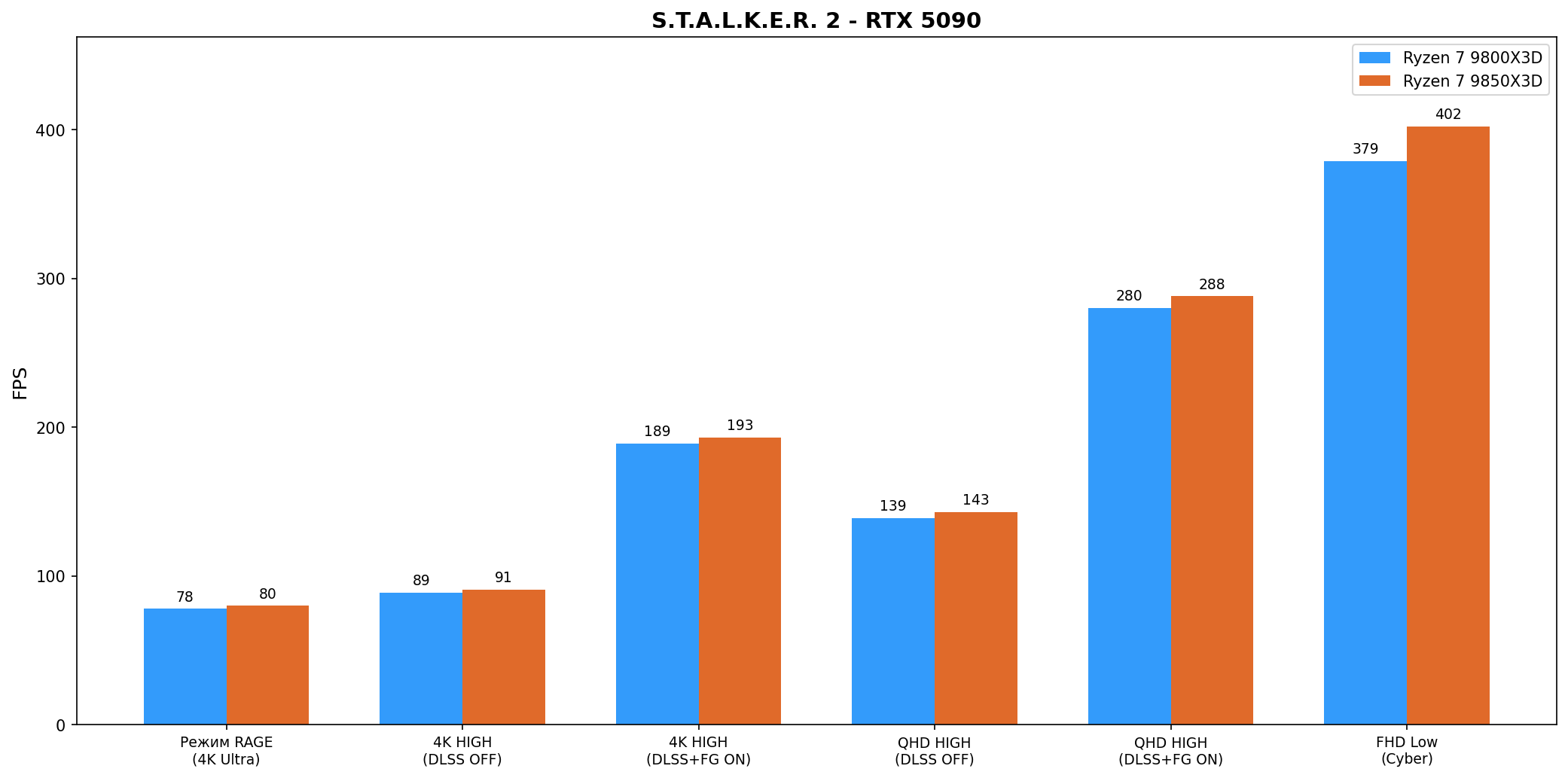 В обычных AAA-играх ситуация похожая. При разрешении 1440p с высокими настройками графики даже мощная RTX 5090 становится ограничивающим фактором, и разница между топовыми процессорами AMD практически исчезает. Лишь при снижении настроек до Medium или Low можно увидеть реальное преимущество 9850X3D.