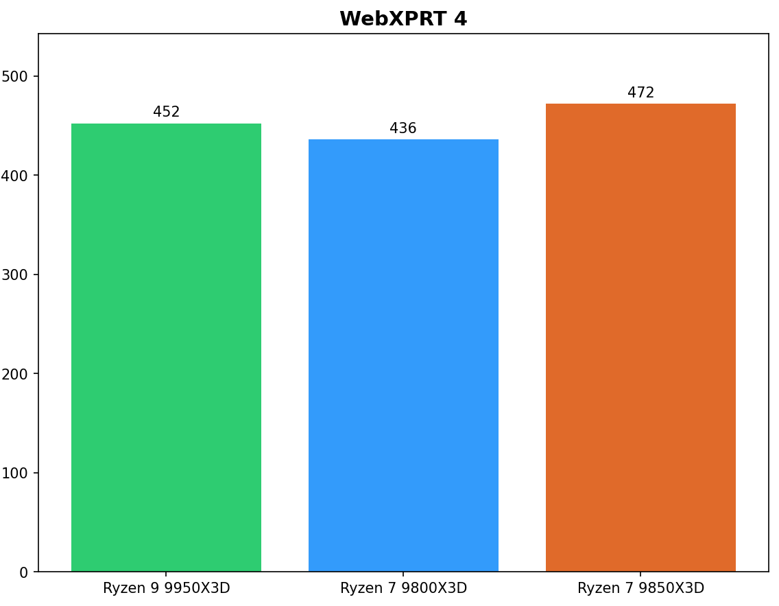 В браузерных бенчмарках Ryzen 7 9850X3D показал лучшие результаты среди всех протестированных процессоров. В WebXPRT 4 он набрал 472 балла против 436 у 9800X3D и 452 у Ryzen 9 9950X3D. «Лишние» 8% являются приятным бонусом для новых владельцев.