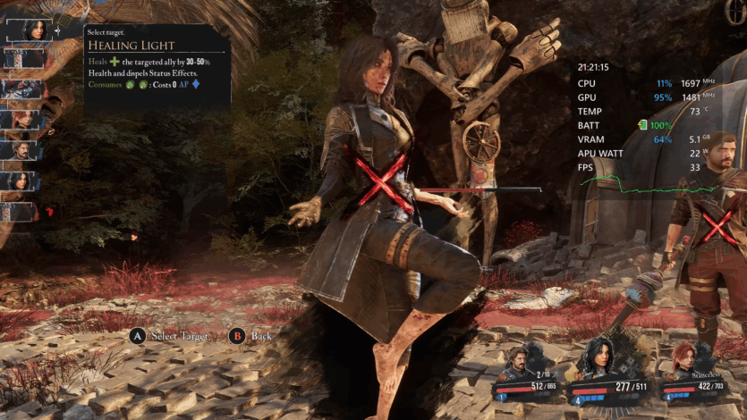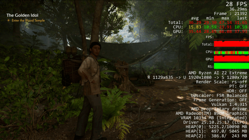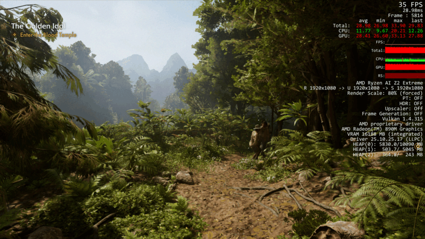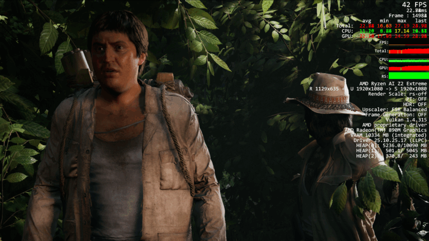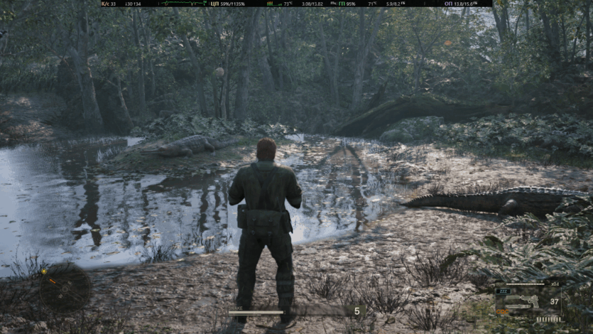 Если Снейка спасали небольшие размеры локаций, то долгострой S.T.A.L.K.E.R. 2: Heart of Chornobyl не об этом. Для открытых миров необходим еще более высокий уровень знаний оптимизаций. Путешествовать по Зоне приемлемо, но Залесье показывает куда еще fps может упасть. Из интересного, Тихий режим (13 Вт) показывает производительность уровня 15 Вт Steam Deck. В Сталкере 2 встроенный генератор кадров который возвращает приемлемый уровень производительности.