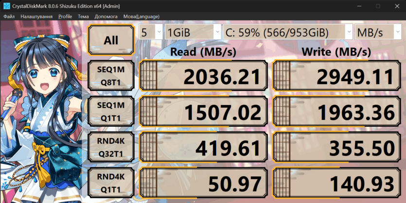 В консоли ROG Xbox Ally X расположен лишь один слот М.2 размера 2280 с поддержкой PCIe 4.0 x4. Это стандартный SSD, поэтому в тесте CrystalDiskMark показал хорошие результаты.