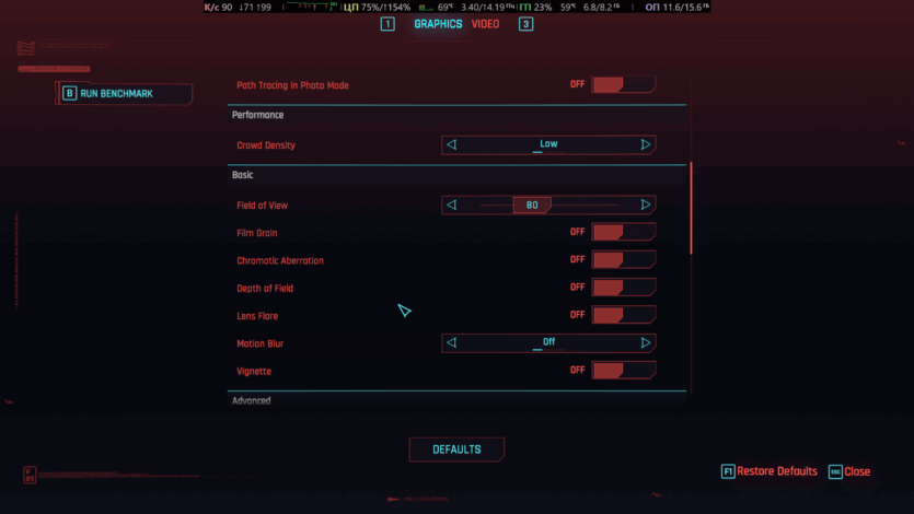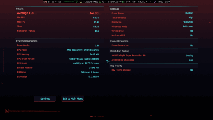Для Cyberpunk 2077 возьмем настройки от Steam Deck и изменим FSR 2.0 (выглядит ужасно) на FSR 3.0. Ради еще большего количества кадров уменьшим разрешение до 900р (1600х900). Значение FSR выставляем на Качество (Quality) и получим 60 fps.