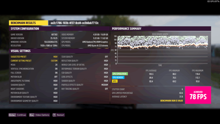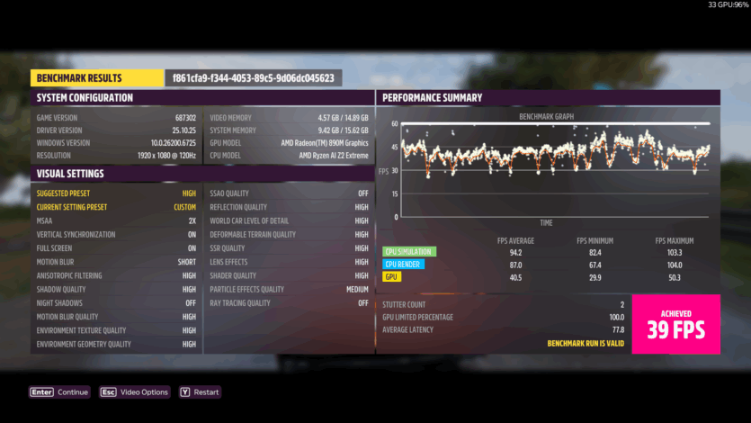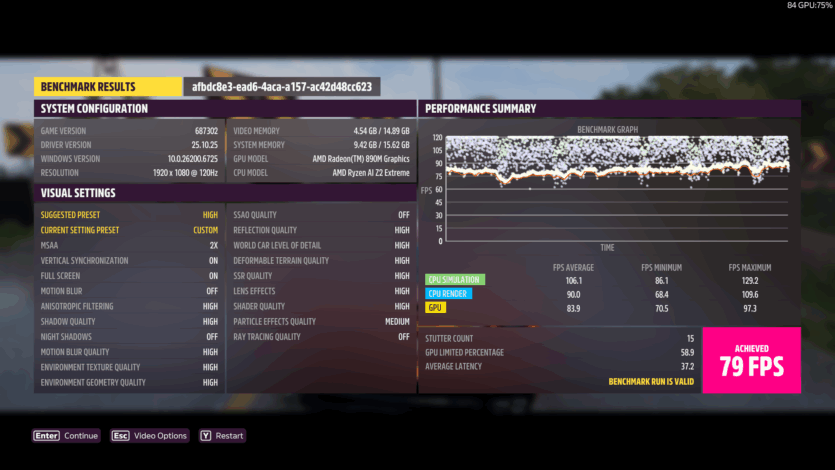 Лично мне было интересно исследовать вопрос влияния производительных и энергоэффективных ядер в мобильных процессорах. Благодаря ROG Xbox Ally X, смог частично удовлетворить свое желание. Возьмем игру Forza Horizon 5, в которой встроен бенчмарк. Игра хорошо оптимизирована, поэтому вероятности случайных событий будет меньше всего. Результаты двух с половиной часов тестов в таблице ниже.