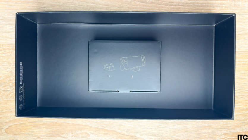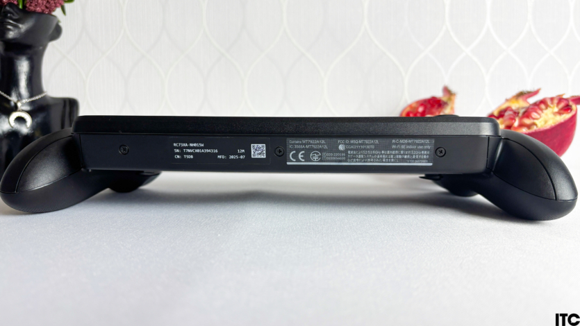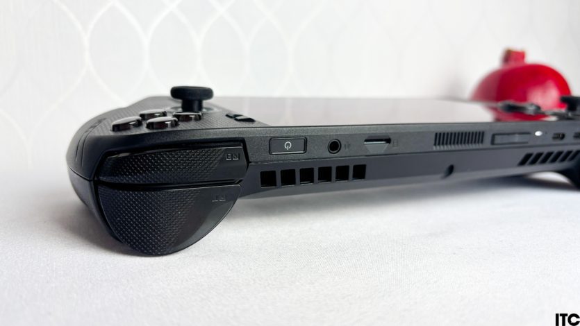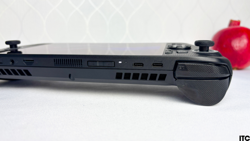 Система охлаждения состоит из одной медной трубки и двух вентиляторов. Забор воздуха происходит с задней части корпуса, даже логотип «Бесстрашный глаз» принимает в нем участие. Благодаря этому и общей высоте консоль без проблем можно класть на разные поверхности. Отводится теплый воздух с верхней части, на которой найдем: 2 USB Type-C, два диода для индикации включенного устройства и зарядки, клавиши громкости, 3,5 комбинированный аудиоразъем, считыватель microSD карт памяти и клавишу включения со спаренным сканером отпечатков пальцев. Снизу расположена информация о консоли.