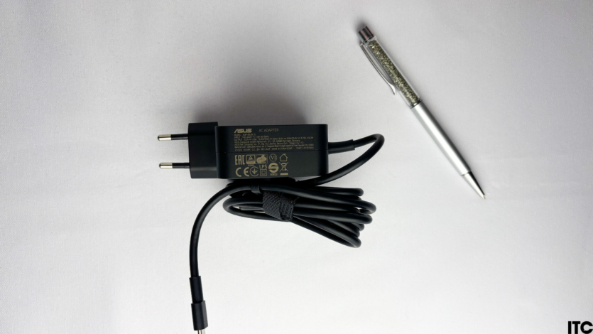 Внутри найдем само устройство, инструкцию, блок питания (65 Вт) с неотсоединяемым кабелем длиной 2 метра и пластиковую подставку.