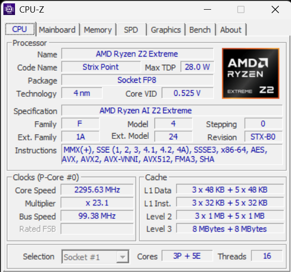Процессор | AMD Ryzen AI Z2 Extreme (8 ядер / 16 потоков, 3 ядра Zen5 + 5 ядер Zen5c, 3.3 / 5 ГГц, 8 МБ L2 / 16 МБ L3, AMD XDNA NPU до 50 TOPS) |