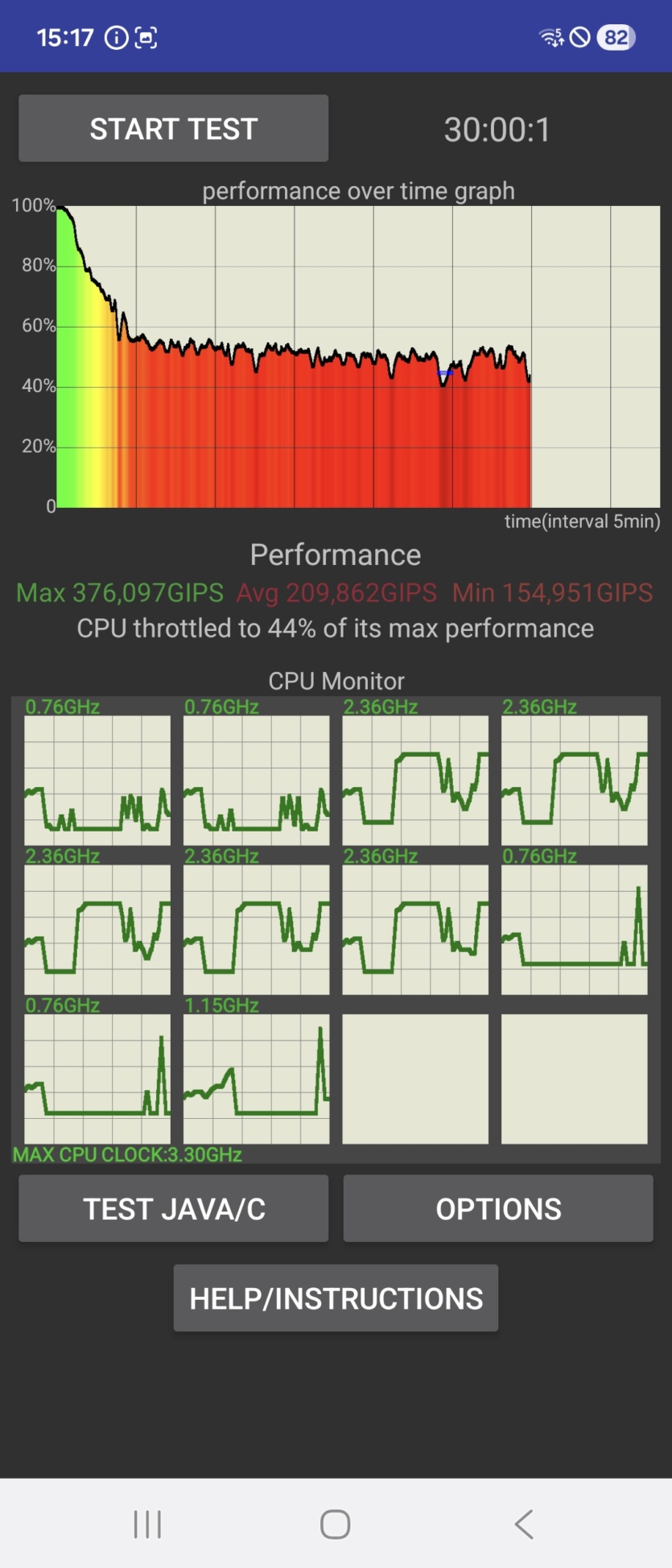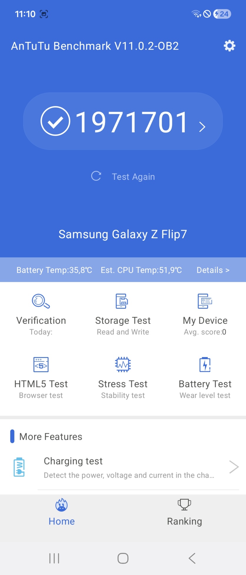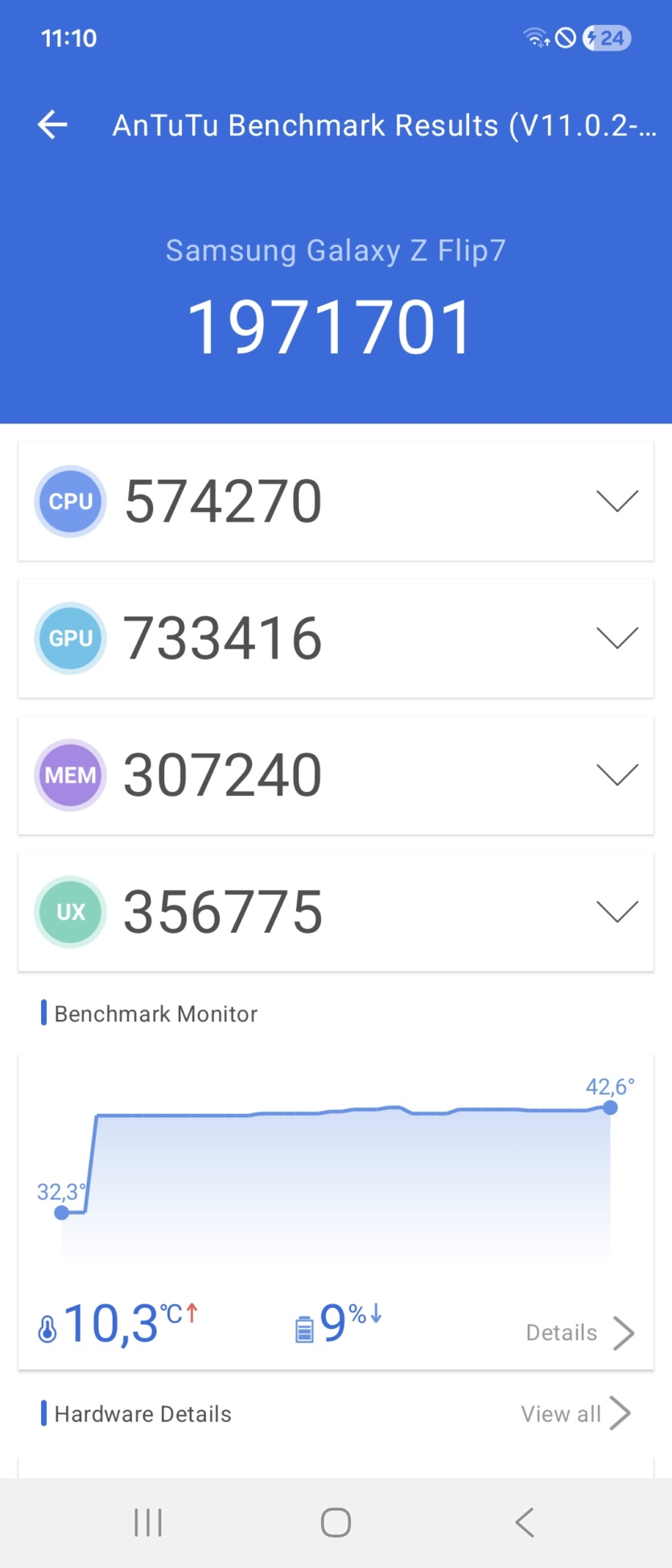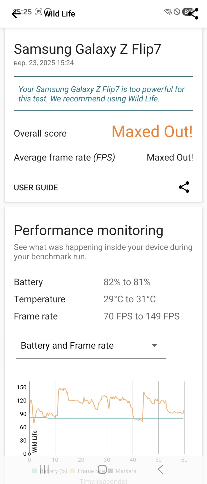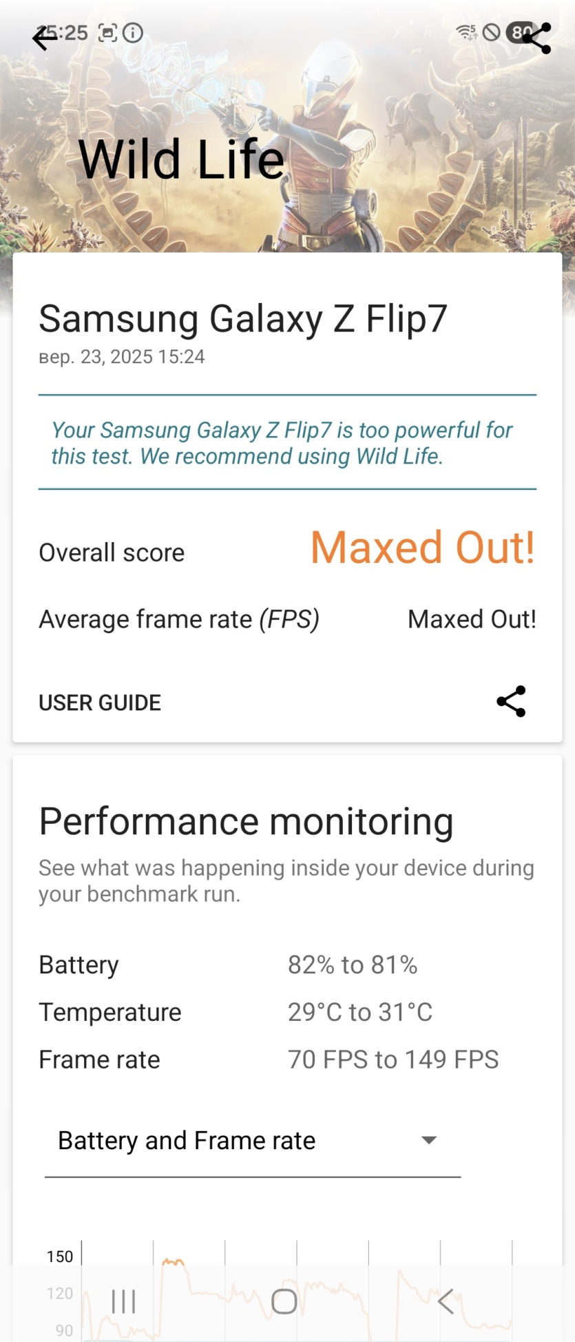 В повседневном использовании с соцсетями, YouTube и мессенджерами разница, конечно, не ощущается. Все работает быстро и плавно. Но если запустить тяжелую игру, то картина сразу меняется. Смартфон начинает заметно нагреваться. В стресс-тестах производительность может существенно упасть из-за троттлинга, что вы сами видите по скриншотам. Это значит, что для серьезного гейминга Samsung Galaxy Flip 7 не подходит. Если вы любите Genshin Impact или подобные проекты, то лучше присмотритесь к чему-то другому.