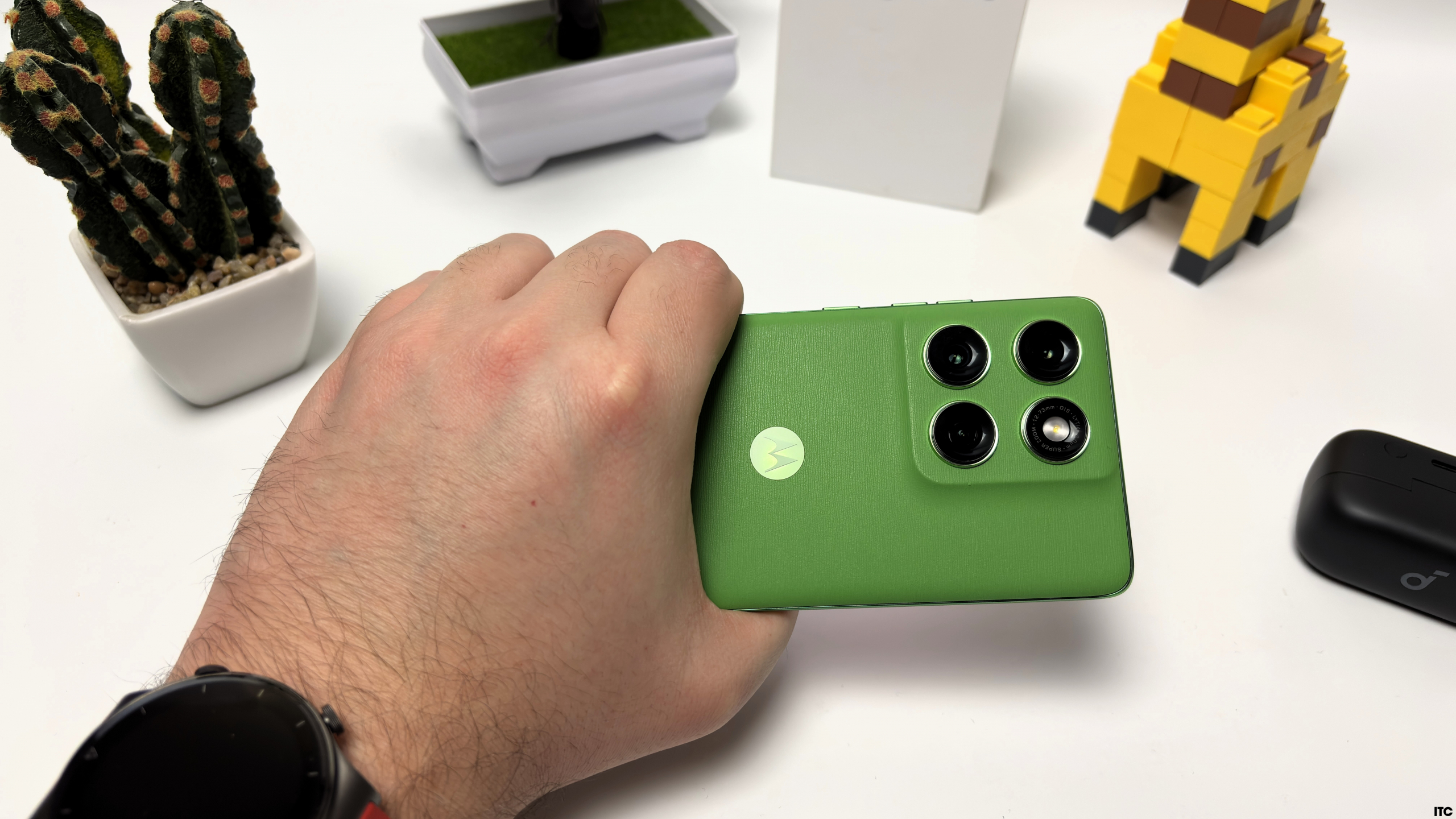 Motorola Edge 60 выглядит как смартфон, который очень хочет выделиться, и надо признать, ему это удается. Вместо стекла с градиентами здесь текстурированная спинка, которая в нашем случае выполнена под кожу в цвете PANTONE Shamrock. Выглядит необычно, особенно на фоне однотипных глянцевых брусков.