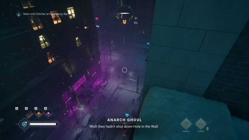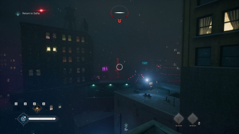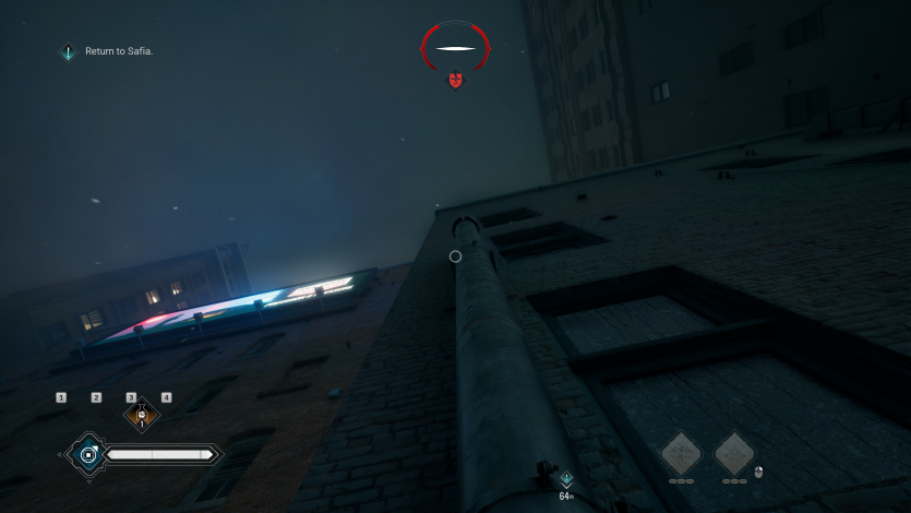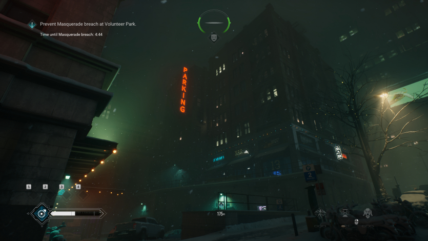Паркур в Bloodlines 2 работает лучше, чем можно было ожидать для RPG с открытым миром. Перемещение по крышам, узким проходам и внешним конструкциям ощущается естественным и напоминает микс Dying Light: The Beast, Mirror`s Edge и Marvel’s Spider-Man. Прыжки и лазание реализованы плавно, без серьезных технических проблем. Эта механика действительно добавляет ощущение вертикальной свободы и позволяет по-новому исследовать Сиэтл.