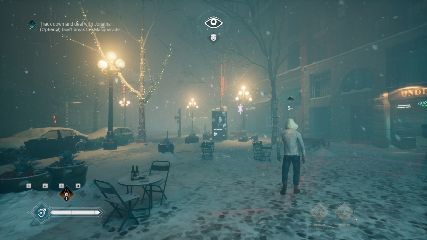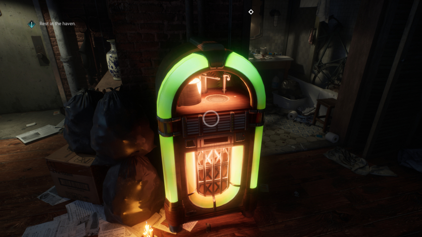 Интеграция музыки в игровой процесс заслуживает отдельного внимания. Она реагирует на действия игрока, меняя темп и настроение сцены. Например, в барах или на улицах Сиэтла звучат джукбоксовые композиции, добавляющие ощущение реальной жизни вампиров и их будничных ритуалов. Собственно, в нашем импровизированном логове один такой олдскульный музыкальный аппарат и стоит.