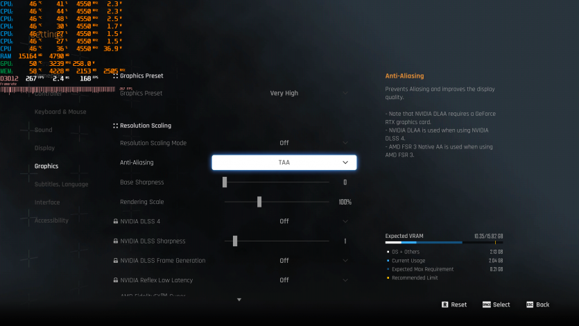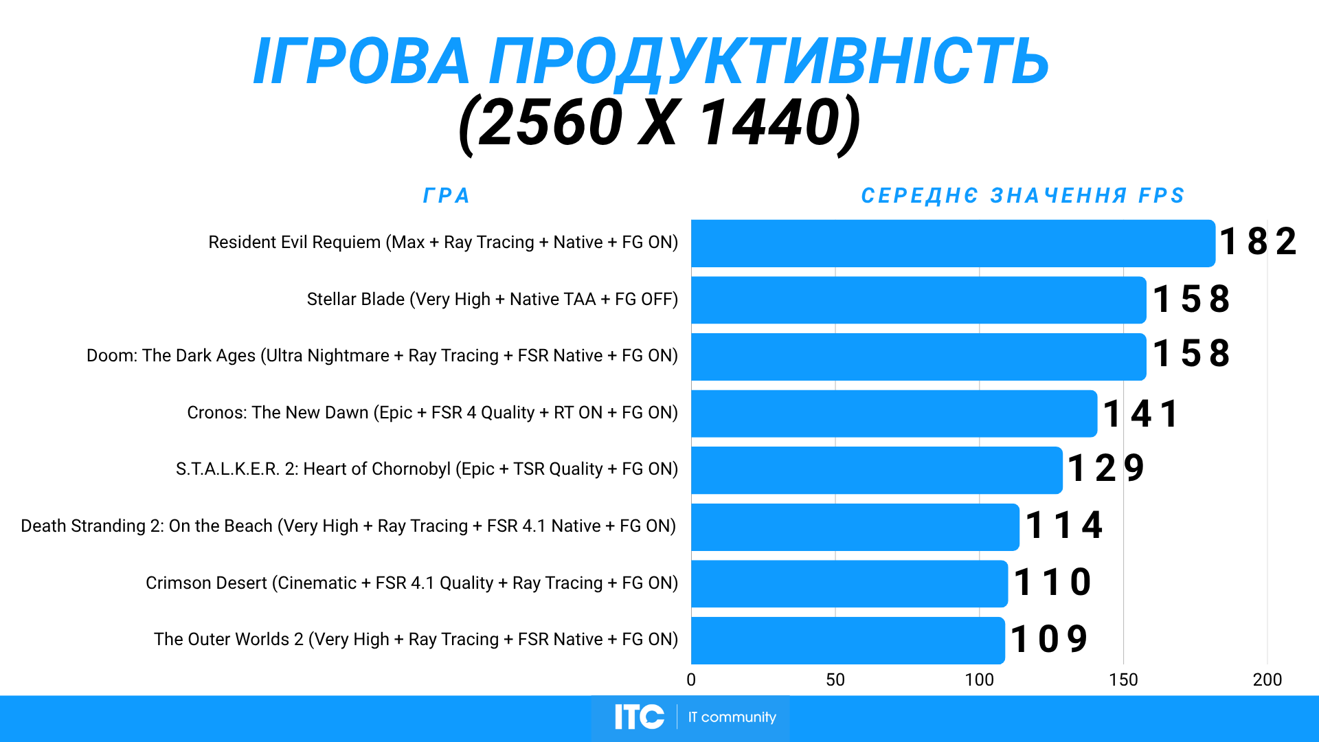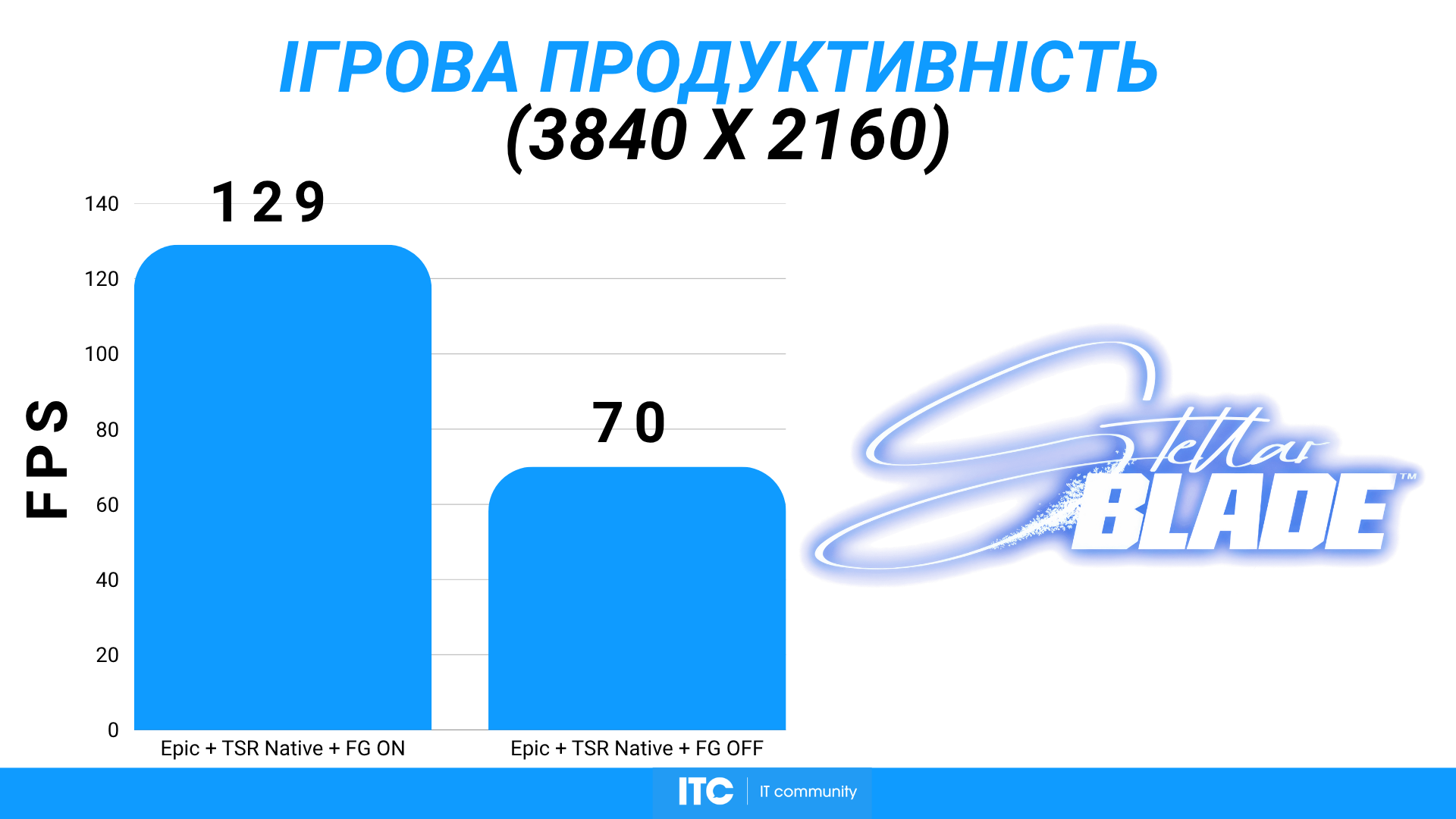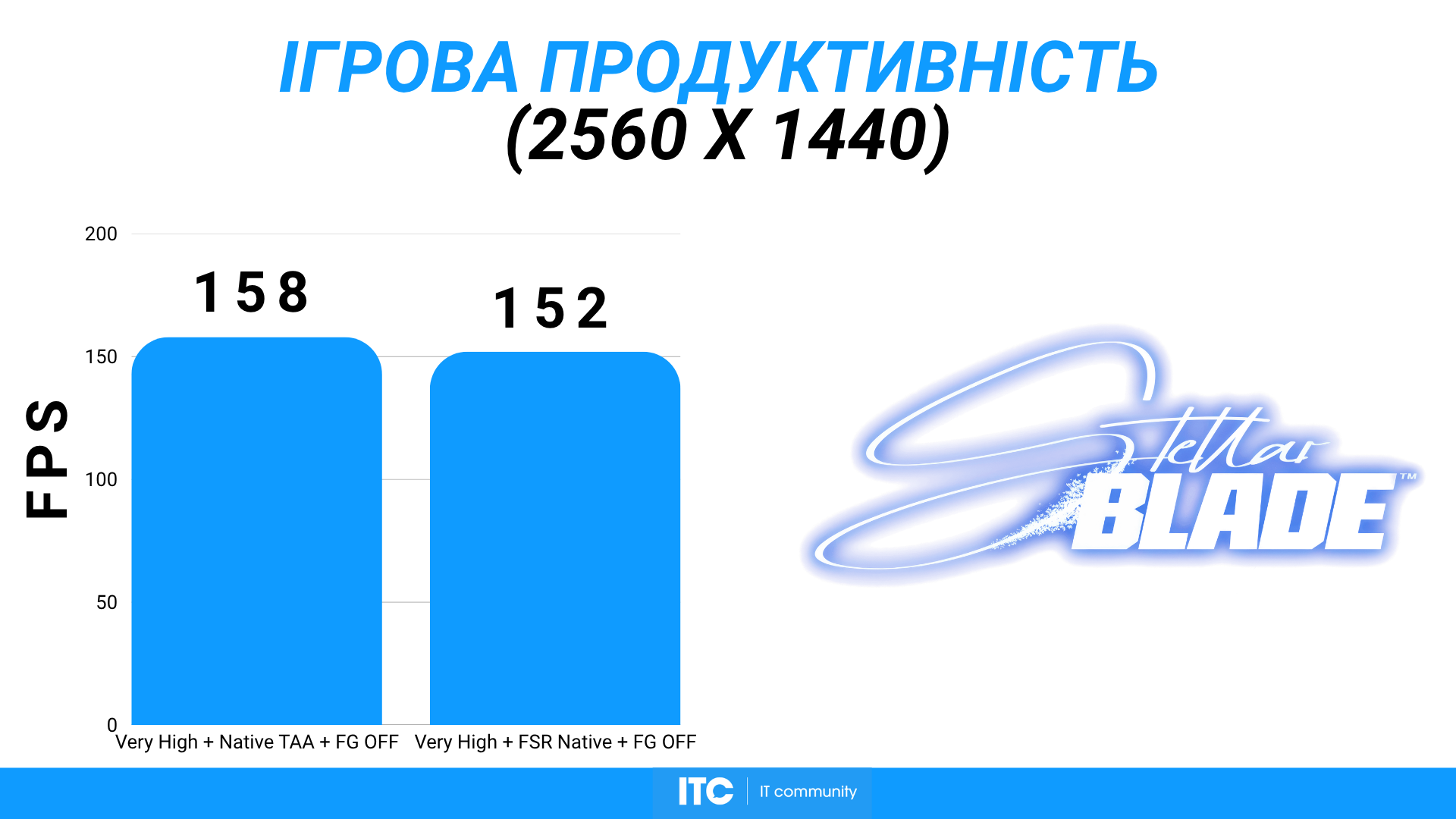 Stellar Blade на Very High с нативным TAA и без генерации кадров держит около 158 FPS. Это показательный пример чистой растеризации без «усилителей» производительности.