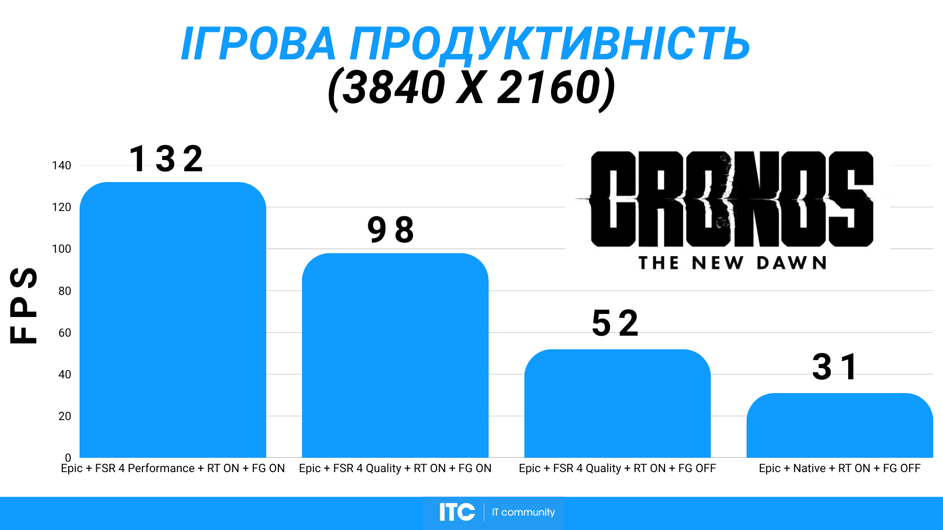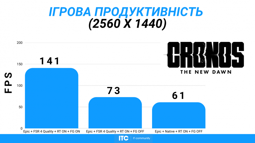 Cronos: The New Dawn с настройками Epic, FSR 4 Quality, включенным RT и генерацией кадров показывает ~141 FPS. Карта ведет себя стабильно и тихо.